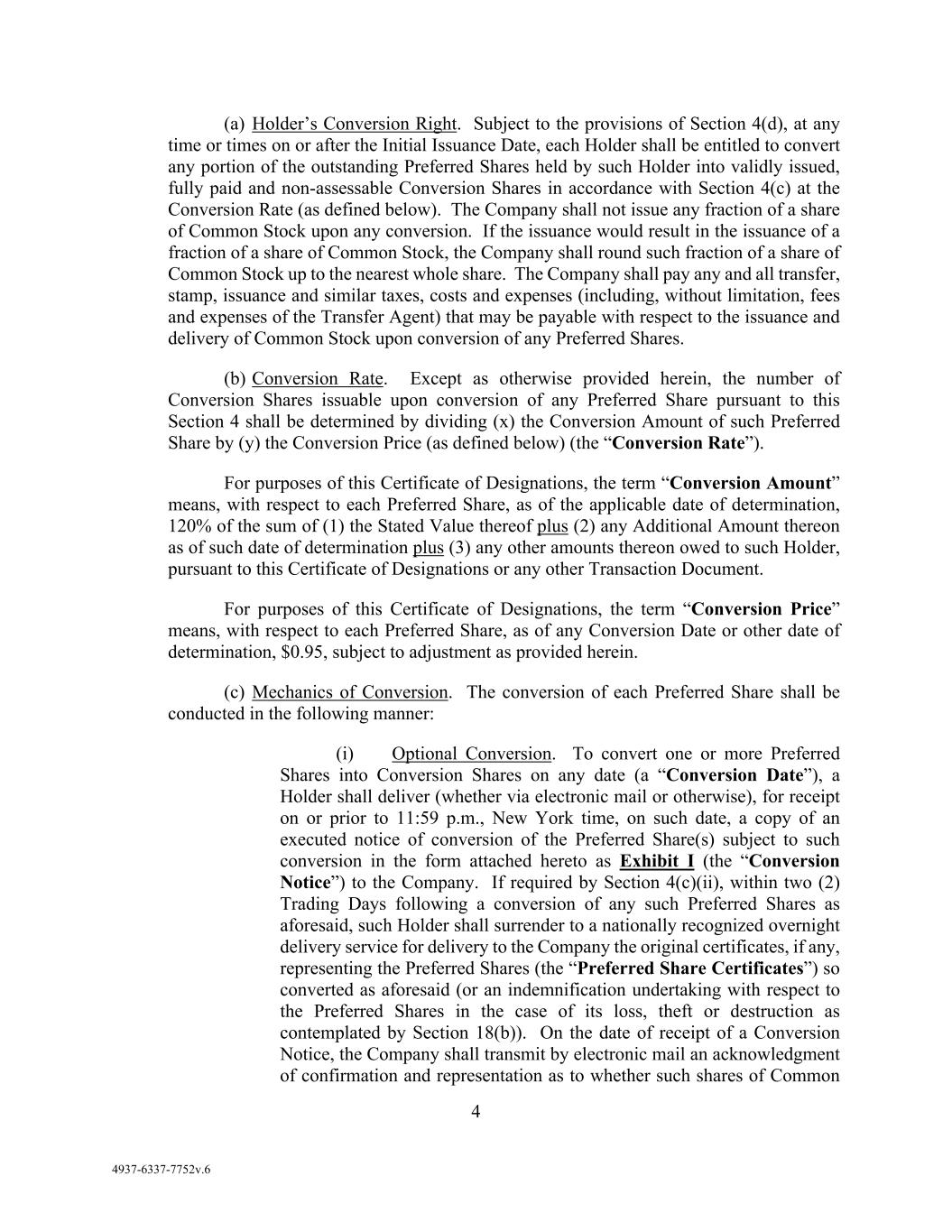 4 4937-6337-7752v.6 (a) Holder’s Conversion Right. Subject to the provisions of Section 4(d), at any time or times on or after the Initial Issuance Date, each Holder shall be entitled to convert any portion of the outstanding Preferred Shares held by such Holder into validly issued, fully paid and non-assessable Conversion Shares in accordance with Section 4(c) at the Conversion Rate (as defined below). The Company shall not issue any fraction of a share of Common Stock upon any conversion. If the issuance would result in the issuance of a fraction of a share of Common Stock, the Company shall round such fraction of a share of Common Stock up to the nearest whole share. The Company shall pay any and all transfer, stamp, issuance and similar taxes, costs and expenses (including, without limitation, fees and expenses of the Transfer Agent) that may be payable with respect to the issuance and delivery of Common Stock upon conversion of any Preferred Shares. (b) Conversion Rate. Except as otherwise provided herein, the number of Conversion Shares issuable upon conversion of any Preferred Share pursuant to this Section 4 shall be determined by dividing (x) the Conversion Amount of such Preferred Share by (y) the Conversion Price (as defined below) (the “Conversion Rate”). For purposes of this Certificate of Designations, the term “Conversion Amount” means, with respect to each Preferred Share, as of the applicable date of determination, 120% of the sum of (1) the Stated Value thereof plus (2) any Additional Amount thereon as of such date of determination plus (3) any other amounts thereon owed to such Holder, pursuant to this Certificate of Designations or any other Transaction Document. For purposes of this Certificate of Designations, the term “Conversion Price” means, with respect to each Preferred Share, as of any Conversion Date or other date of determination, $0.95, subject to adjustment as provided herein. (c) Mechanics of Conversion. The conversion of each Preferred Share shall be conducted in the following manner: (i) Optional Conversion. To convert one or more Preferred Shares into Conversion Shares on any date (a “Conversion Date”), a Holder shall deliver (whether via electronic mail or otherwise), for receipt on or prior to 11:59 p.m., New York time, on such date, a copy of an executed notice of conversion of the Preferred Share(s) subject to such conversion in the form attached hereto as Exhibit I (the “Conversion Notice”) to the Company. If required by Section 4(c)(ii), within two (2) Trading Days following a conversion of any such Preferred Shares as aforesaid, such Holder shall surrender to a nationally recognized overnight delivery service for delivery to the Company the original certificates, if any, representing the Preferred Shares (the “Preferred Share Certificates”) so converted as aforesaid (or an indemnification undertaking with respect to the Preferred Shares in the case of its loss, theft or destruction as contemplated by Section 18(b)). On the date of receipt of a Conversion Notice, the Company shall transmit by electronic mail an acknowledgment of confirmation and representation as to whether such shares of Common