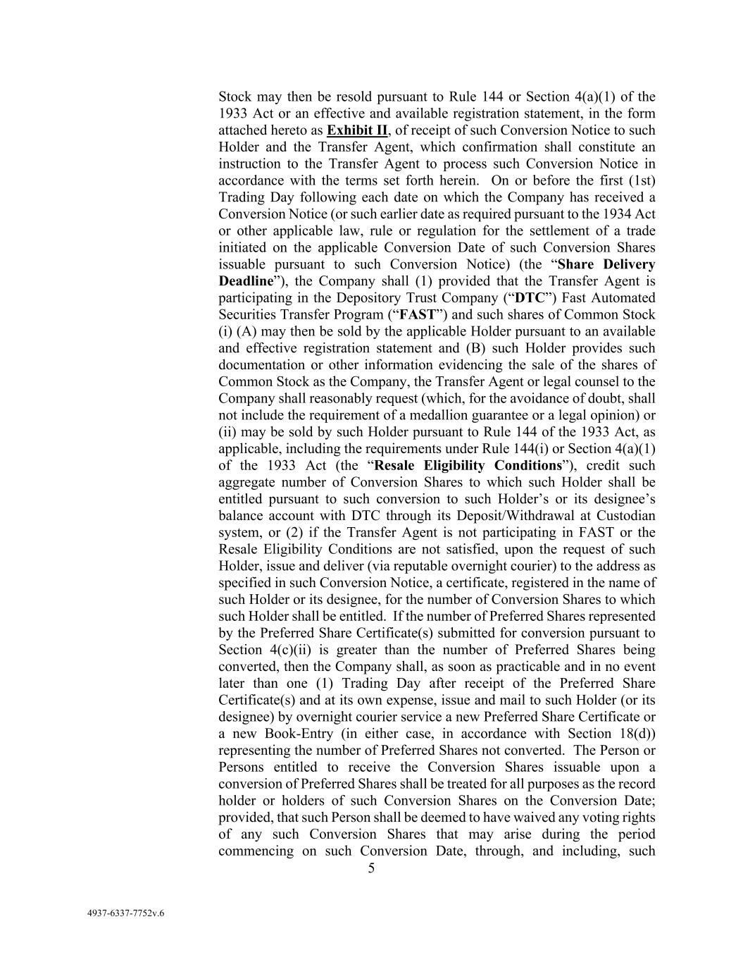 5 4937-6337-7752v.6 Stock may then be resold pursuant to Rule 144 or Section 4(a)(1) of the 1933 Act or an effective and available registration statement, in the form attached hereto as Exhibit II, of receipt of such Conversion Notice to such Holder and the Transfer Agent, which confirmation shall constitute an instruction to the Transfer Agent to process such Conversion Notice in accordance with the terms set forth herein. On or before the first (1st) Trading Day following each date on which the Company has received a Conversion Notice (or such earlier date as required pursuant to the 1934 Act or other applicable law, rule or regulation for the settlement of a trade initiated on the applicable Conversion Date of such Conversion Shares issuable pursuant to such Conversion Notice) (the “Share Delivery Deadline”), the Company shall (1) provided that the Transfer Agent is participating in the Depository Trust Company (“DTC”) Fast Automated Securities Transfer Program (“FAST”) and such shares of Common Stock (i) (A) may then be sold by the applicable Holder pursuant to an available and effective registration statement and (B) such Holder provides such documentation or other information evidencing the sale of the shares of Common Stock as the Company, the Transfer Agent or legal counsel to the Company shall reasonably request (which, for the avoidance of doubt, shall not include the requirement of a medallion guarantee or a legal opinion) or (ii) may be sold by such Holder pursuant to Rule 144 of the 1933 Act, as applicable, including the requirements under Rule 144(i) or Section 4(a)(1) of the 1933 Act (the “Resale Eligibility Conditions”), credit such aggregate number of Conversion Shares to which such Holder shall be entitled pursuant to such conversion to such Holder’s or its designee’s balance account with DTC through its Deposit/Withdrawal at Custodian system, or (2) if the Transfer Agent is not participating in FAST or the Resale Eligibility Conditions are not satisfied, upon the request of such Holder, issue and deliver (via reputable overnight courier) to the address as specified in such Conversion Notice, a certificate, registered in the name of such Holder or its designee, for the number of Conversion Shares to which such Holder shall be entitled. If the number of Preferred Shares represented by the Preferred Share Certificate(s) submitted for conversion pursuant to Section 4(c)(ii) is greater than the number of Preferred Shares being converted, then the Company shall, as soon as practicable and in no event later than one (1) Trading Day after receipt of the Preferred Share Certificate(s) and at its own expense, issue and mail to such Holder (or its designee) by overnight courier service a new Preferred Share Certificate or a new Book-Entry (in either case, in accordance with Section 18(d)) representing the number of Preferred Shares not converted. The Person or Persons entitled to receive the Conversion Shares issuable upon a conversion of Preferred Shares shall be treated for all purposes as the record holder or holders of such Conversion Shares on the Conversion Date; provided, that such Person shall be deemed to have waived any voting rights of any such Conversion Shares that may arise during the period commencing on such Conversion Date, through, and including, such