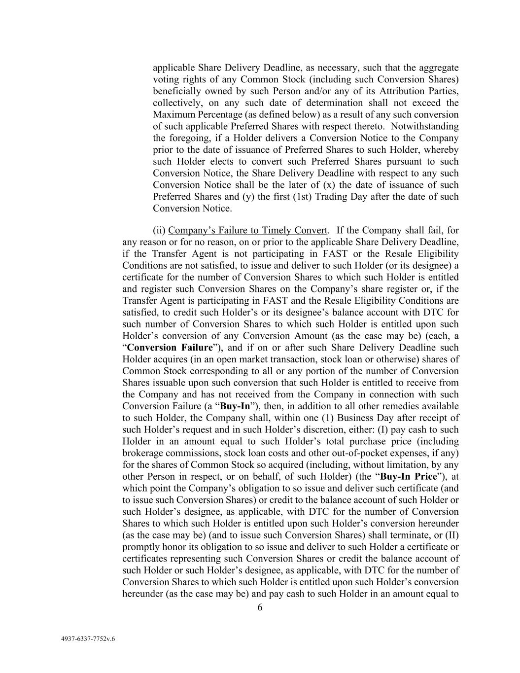 6 4937-6337-7752v.6 applicable Share Delivery Deadline, as necessary, such that the aggregate voting rights of any Common Stock (including such Conversion Shares) beneficially owned by such Person and/or any of its Attribution Parties, collectively, on any such date of determination shall not exceed the Maximum Percentage (as defined below) as a result of any such conversion of such applicable Preferred Shares with respect thereto. Notwithstanding the foregoing, if a Holder delivers a Conversion Notice to the Company prior to the date of issuance of Preferred Shares to such Holder, whereby such Holder elects to convert such Preferred Shares pursuant to such Conversion Notice, the Share Delivery Deadline with respect to any such Conversion Notice shall be the later of (x) the date of issuance of such Preferred Shares and (y) the first (1st) Trading Day after the date of such Conversion Notice. (ii) Company’s Failure to Timely Convert. If the Company shall fail, for any reason or for no reason, on or prior to the applicable Share Delivery Deadline, if the Transfer Agent is not participating in FAST or the Resale Eligibility Conditions are not satisfied, to issue and deliver to such Holder (or its designee) a certificate for the number of Conversion Shares to which such Holder is entitled and register such Conversion Shares on the Company’s share register or, if the Transfer Agent is participating in FAST and the Resale Eligibility Conditions are satisfied, to credit such Holder’s or its designee’s balance account with DTC for such number of Conversion Shares to which such Holder is entitled upon such Holder’s conversion of any Conversion Amount (as the case may be) (each, a “Conversion Failure”), and if on or after such Share Delivery Deadline such Holder acquires (in an open market transaction, stock loan or otherwise) shares of Common Stock corresponding to all or any portion of the number of Conversion Shares issuable upon such conversion that such Holder is entitled to receive from the Company and has not received from the Company in connection with such Conversion Failure (a “Buy-In”), then, in addition to all other remedies available to such Holder, the Company shall, within one (1) Business Day after receipt of such Holder’s request and in such Holder’s discretion, either: (I) pay cash to such Holder in an amount equal to such Holder’s total purchase price (including brokerage commissions, stock loan costs and other out-of-pocket expenses, if any) for the shares of Common Stock so acquired (including, without limitation, by any other Person in respect, or on behalf, of such Holder) (the “Buy-In Price”), at which point the Company’s obligation to so issue and deliver such certificate (and to issue such Conversion Shares) or credit to the balance account of such Holder or such Holder’s designee, as applicable, with DTC for the number of Conversion Shares to which such Holder is entitled upon such Holder’s conversion hereunder (as the case may be) (and to issue such Conversion Shares) shall terminate, or (II) promptly honor its obligation to so issue and deliver to such Holder a certificate or certificates representing such Conversion Shares or credit the balance account of such Holder or such Holder’s designee, as applicable, with DTC for the number of Conversion Shares to which such Holder is entitled upon such Holder’s conversion hereunder (as the case may be) and pay cash to such Holder in an amount equal to