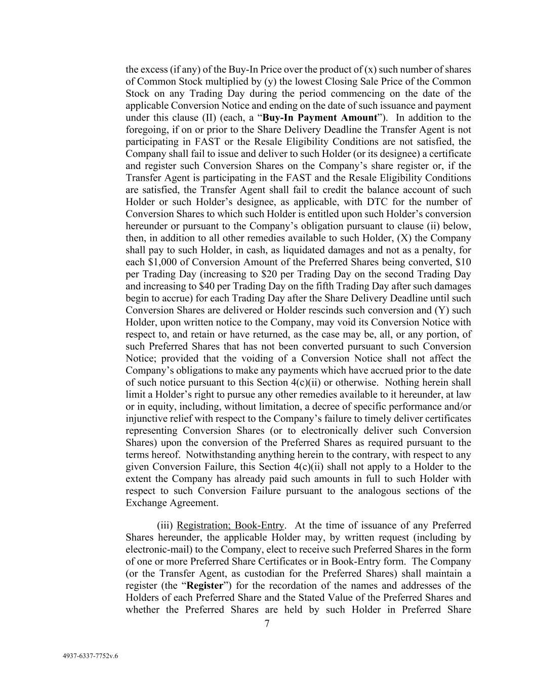 7 4937-6337-7752v.6 the excess (if any) of the Buy-In Price over the product of (x) such number of shares of Common Stock multiplied by (y) the lowest Closing Sale Price of the Common Stock on any Trading Day during the period commencing on the date of the applicable Conversion Notice and ending on the date of such issuance and payment under this clause (II) (each, a “Buy-In Payment Amount”). In addition to the foregoing, if on or prior to the Share Delivery Deadline the Transfer Agent is not participating in FAST or the Resale Eligibility Conditions are not satisfied, the Company shall fail to issue and deliver to such Holder (or its designee) a certificate and register such Conversion Shares on the Company’s share register or, if the Transfer Agent is participating in the FAST and the Resale Eligibility Conditions are satisfied, the Transfer Agent shall fail to credit the balance account of such Holder or such Holder’s designee, as applicable, with DTC for the number of Conversion Shares to which such Holder is entitled upon such Holder’s conversion hereunder or pursuant to the Company’s obligation pursuant to clause (ii) below, then, in addition to all other remedies available to such Holder, (X) the Company shall pay to such Holder, in cash, as liquidated damages and not as a penalty, for each $1,000 of Conversion Amount of the Preferred Shares being converted, $10 per Trading Day (increasing to $20 per Trading Day on the second Trading Day and increasing to $40 per Trading Day on the fifth Trading Day after such damages begin to accrue) for each Trading Day after the Share Delivery Deadline until such Conversion Shares are delivered or Holder rescinds such conversion and (Y) such Holder, upon written notice to the Company, may void its Conversion Notice with respect to, and retain or have returned, as the case may be, all, or any portion, of such Preferred Shares that has not been converted pursuant to such Conversion Notice; provided that the voiding of a Conversion Notice shall not affect the Company’s obligations to make any payments which have accrued prior to the date of such notice pursuant to this Section 4(c)(ii) or otherwise. Nothing herein shall limit a Holder’s right to pursue any other remedies available to it hereunder, at law or in equity, including, without limitation, a decree of specific performance and/or injunctive relief with respect to the Company’s failure to timely deliver certificates representing Conversion Shares (or to electronically deliver such Conversion Shares) upon the conversion of the Preferred Shares as required pursuant to the terms hereof. Notwithstanding anything herein to the contrary, with respect to any given Conversion Failure, this Section 4(c)(ii) shall not apply to a Holder to the extent the Company has already paid such amounts in full to such Holder with respect to such Conversion Failure pursuant to the analogous sections of the Exchange Agreement. (iii) Registration; Book-Entry. At the time of issuance of any Preferred Shares hereunder, the applicable Holder may, by written request (including by electronic-mail) to the Company, elect to receive such Preferred Shares in the form of one or more Preferred Share Certificates or in Book-Entry form. The Company (or the Transfer Agent, as custodian for the Preferred Shares) shall maintain a register (the “Register”) for the recordation of the names and addresses of the Holders of each Preferred Share and the Stated Value of the Preferred Shares and whether the Preferred Shares are held by such Holder in Preferred Share