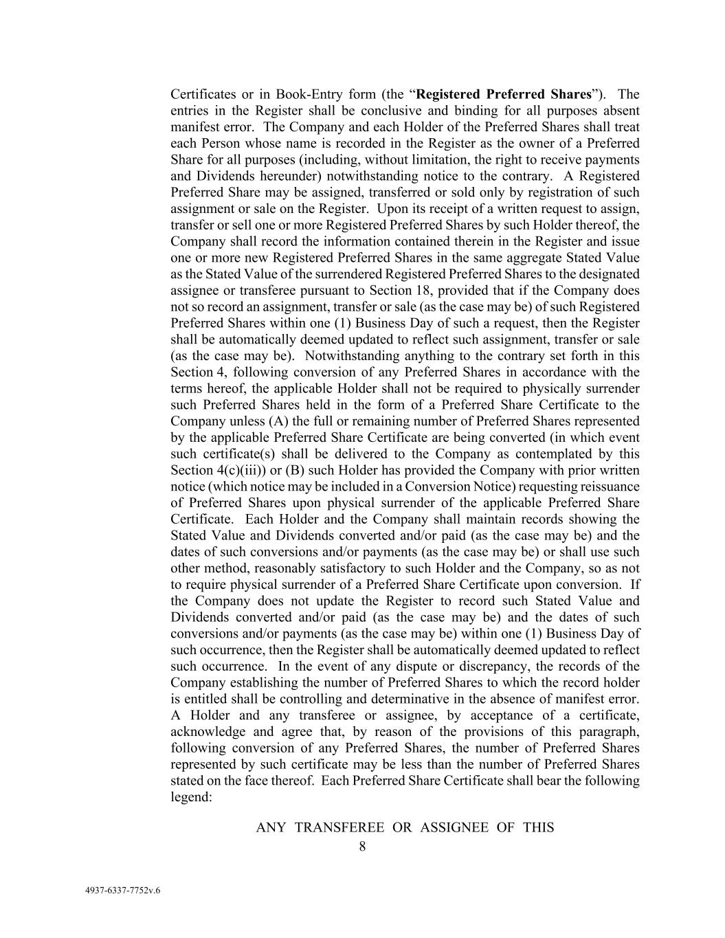 8 4937-6337-7752v.6 Certificates or in Book-Entry form (the “Registered Preferred Shares”). The entries in the Register shall be conclusive and binding for all purposes absent manifest error. The Company and each Holder of the Preferred Shares shall treat each Person whose name is recorded in the Register as the owner of a Preferred Share for all purposes (including, without limitation, the right to receive payments and Dividends hereunder) notwithstanding notice to the contrary. A Registered Preferred Share may be assigned, transferred or sold only by registration of such assignment or sale on the Register. Upon its receipt of a written request to assign, transfer or sell one or more Registered Preferred Shares by such Holder thereof, the Company shall record the information contained therein in the Register and issue one or more new Registered Preferred Shares in the same aggregate Stated Value as the Stated Value of the surrendered Registered Preferred Shares to the designated assignee or transferee pursuant to Section 18, provided that if the Company does not so record an assignment, transfer or sale (as the case may be) of such Registered Preferred Shares within one (1) Business Day of such a request, then the Register shall be automatically deemed updated to reflect such assignment, transfer or sale (as the case may be). Notwithstanding anything to the contrary set forth in this Section 4, following conversion of any Preferred Shares in accordance with the terms hereof, the applicable Holder shall not be required to physically surrender such Preferred Shares held in the form of a Preferred Share Certificate to the Company unless (A) the full or remaining number of Preferred Shares represented by the applicable Preferred Share Certificate are being converted (in which event such certificate(s) shall be delivered to the Company as contemplated by this Section 4(c)(iii)) or (B) such Holder has provided the Company with prior written notice (which notice may be included in a Conversion Notice) requesting reissuance of Preferred Shares upon physical surrender of the applicable Preferred Share Certificate. Each Holder and the Company shall maintain records showing the Stated Value and Dividends converted and/or paid (as the case may be) and the dates of such conversions and/or payments (as the case may be) or shall use such other method, reasonably satisfactory to such Holder and the Company, so as not to require physical surrender of a Preferred Share Certificate upon conversion. If the Company does not update the Register to record such Stated Value and Dividends converted and/or paid (as the case may be) and the dates of such conversions and/or payments (as the case may be) within one (1) Business Day of such occurrence, then the Register shall be automatically deemed updated to reflect such occurrence. In the event of any dispute or discrepancy, the records of the Company establishing the number of Preferred Shares to which the record holder is entitled shall be controlling and determinative in the absence of manifest error. A Holder and any transferee or assignee, by acceptance of a certificate, acknowledge and agree that, by reason of the provisions of this paragraph, following conversion of any Preferred Shares, the number of Preferred Shares represented by such certificate may be less than the number of Preferred Shares stated on the face thereof. Each Preferred Share Certificate shall bear the following legend: ANY TRANSFEREE OR ASSIGNEE OF THIS
