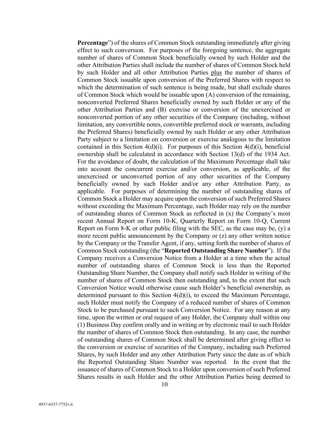 10 4937-6337-7752v.6 Percentage”) of the shares of Common Stock outstanding immediately after giving effect to such conversion. For purposes of the foregoing sentence, the aggregate number of shares of Common Stock beneficially owned by such Holder and the other Attribution Parties shall include the number of shares of Common Stock held by such Holder and all other Attribution Parties plus the number of shares of Common Stock issuable upon conversion of the Preferred Shares with respect to which the determination of such sentence is being made, but shall exclude shares of Common Stock which would be issuable upon (A) conversion of the remaining, nonconverted Preferred Shares beneficially owned by such Holder or any of the other Attribution Parties and (B) exercise or conversion of the unexercised or nonconverted portion of any other securities of the Company (including, without limitation, any convertible notes, convertible preferred stock or warrants, including the Preferred Shares) beneficially owned by such Holder or any other Attribution Party subject to a limitation on conversion or exercise analogous to the limitation contained in this Section 4(d)(i). For purposes of this Section 4(d)(i), beneficial ownership shall be calculated in accordance with Section 13(d) of the 1934 Act. For the avoidance of doubt, the calculation of the Maximum Percentage shall take into account the concurrent exercise and/or conversion, as applicable, of the unexercised or unconverted portion of any other securities of the Company beneficially owned by such Holder and/or any other Attribution Party, as applicable. For purposes of determining the number of outstanding shares of Common Stock a Holder may acquire upon the conversion of such Preferred Shares without exceeding the Maximum Percentage, such Holder may rely on the number of outstanding shares of Common Stock as reflected in (x) the Company’s most recent Annual Report on Form 10-K, Quarterly Report on Form 10-Q, Current Report on Form 8-K or other public filing with the SEC, as the case may be, (y) a more recent public announcement by the Company or (z) any other written notice by the Company or the Transfer Agent, if any, setting forth the number of shares of Common Stock outstanding (the “Reported Outstanding Share Number”). If the Company receives a Conversion Notice from a Holder at a time when the actual number of outstanding shares of Common Stock is less than the Reported Outstanding Share Number, the Company shall notify such Holder in writing of the number of shares of Common Stock then outstanding and, to the extent that such Conversion Notice would otherwise cause such Holder’s beneficial ownership, as determined pursuant to this Section 4(d)(i), to exceed the Maximum Percentage, such Holder must notify the Company of a reduced number of shares of Common Stock to be purchased pursuant to such Conversion Notice. For any reason at any time, upon the written or oral request of any Holder, the Company shall within one (1) Business Day confirm orally and in writing or by electronic mail to such Holder the number of shares of Common Stock then outstanding. In any case, the number of outstanding shares of Common Stock shall be determined after giving effect to the conversion or exercise of securities of the Company, including such Preferred Shares, by such Holder and any other Attribution Party since the date as of which the Reported Outstanding Share Number was reported. In the event that the issuance of shares of Common Stock to a Holder upon conversion of such Preferred Shares results in such Holder and the other Attribution Parties being deemed to