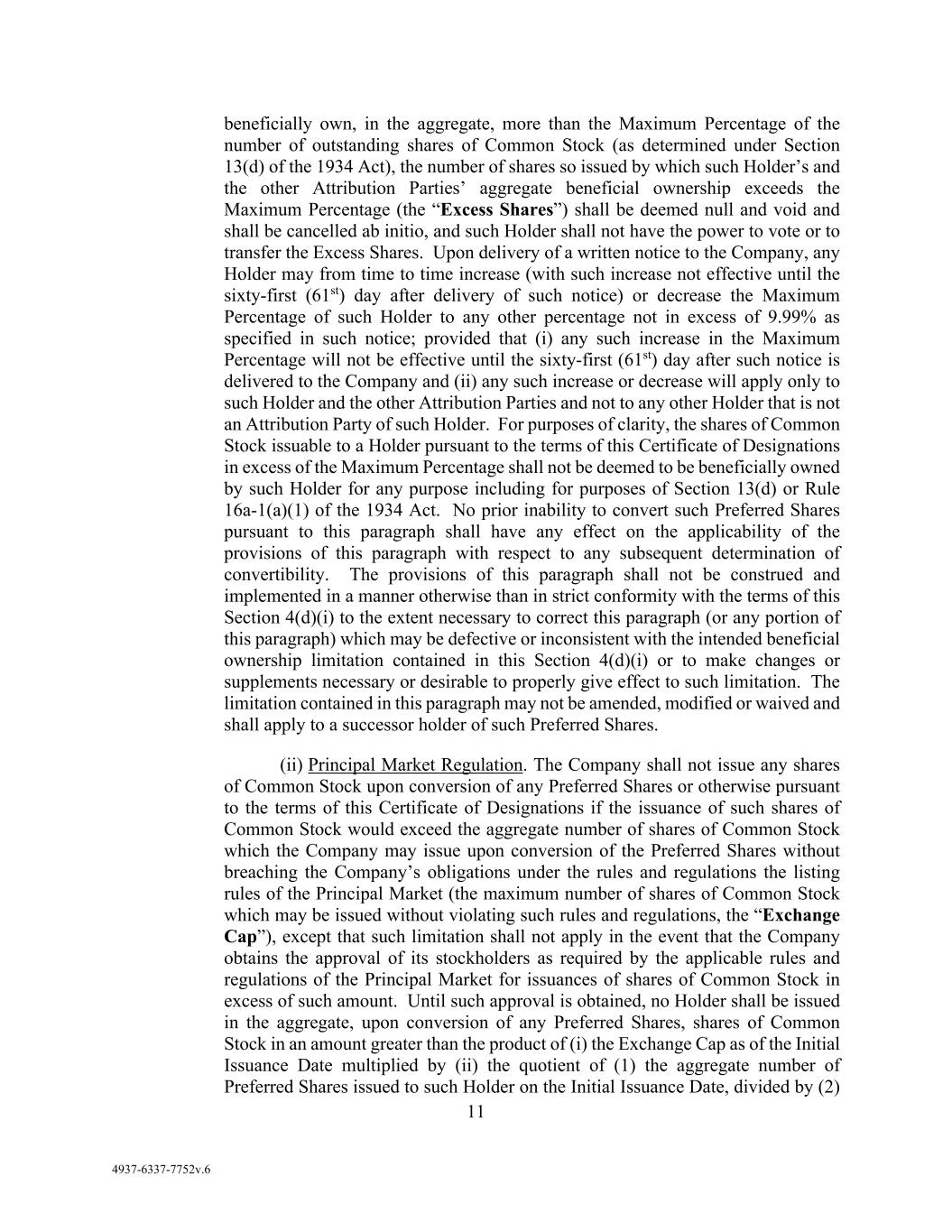11 4937-6337-7752v.6 beneficially own, in the aggregate, more than the Maximum Percentage of the number of outstanding shares of Common Stock (as determined under Section 13(d) of the 1934 Act), the number of shares so issued by which such Holder’s and the other Attribution Parties’ aggregate beneficial ownership exceeds the Maximum Percentage (the “Excess Shares”) shall be deemed null and void and shall be cancelled ab initio, and such Holder shall not have the power to vote or to transfer the Excess Shares. Upon delivery of a written notice to the Company, any Holder may from time to time increase (with such increase not effective until the sixty-first (61st) day after delivery of such notice) or decrease the Maximum Percentage of such Holder to any other percentage not in excess of 9.99% as specified in such notice; provided that (i) any such increase in the Maximum Percentage will not be effective until the sixty-first (61st) day after such notice is delivered to the Company and (ii) any such increase or decrease will apply only to such Holder and the other Attribution Parties and not to any other Holder that is not an Attribution Party of such Holder. For purposes of clarity, the shares of Common Stock issuable to a Holder pursuant to the terms of this Certificate of Designations in excess of the Maximum Percentage shall not be deemed to be beneficially owned by such Holder for any purpose including for purposes of Section 13(d) or Rule 16a-1(a)(1) of the 1934 Act. No prior inability to convert such Preferred Shares pursuant to this paragraph shall have any effect on the applicability of the provisions of this paragraph with respect to any subsequent determination of convertibility. The provisions of this paragraph shall not be construed and implemented in a manner otherwise than in strict conformity with the terms of this Section 4(d)(i) to the extent necessary to correct this paragraph (or any portion of this paragraph) which may be defective or inconsistent with the intended beneficial ownership limitation contained in this Section 4(d)(i) or to make changes or supplements necessary or desirable to properly give effect to such limitation. The limitation contained in this paragraph may not be amended, modified or waived and shall apply to a successor holder of such Preferred Shares. (ii) Principal Market Regulation. The Company shall not issue any shares of Common Stock upon conversion of any Preferred Shares or otherwise pursuant to the terms of this Certificate of Designations if the issuance of such shares of Common Stock would exceed the aggregate number of shares of Common Stock which the Company may issue upon conversion of the Preferred Shares without breaching the Company’s obligations under the rules and regulations the listing rules of the Principal Market (the maximum number of shares of Common Stock which may be issued without violating such rules and regulations, the “Exchange Cap”), except that such limitation shall not apply in the event that the Company obtains the approval of its stockholders as required by the applicable rules and regulations of the Principal Market for issuances of shares of Common Stock in excess of such amount. Until such approval is obtained, no Holder shall be issued in the aggregate, upon conversion of any Preferred Shares, shares of Common Stock in an amount greater than the product of (i) the Exchange Cap as of the Initial Issuance Date multiplied by (ii) the quotient of (1) the aggregate number of Preferred Shares issued to such Holder on the Initial Issuance Date, divided by (2)
