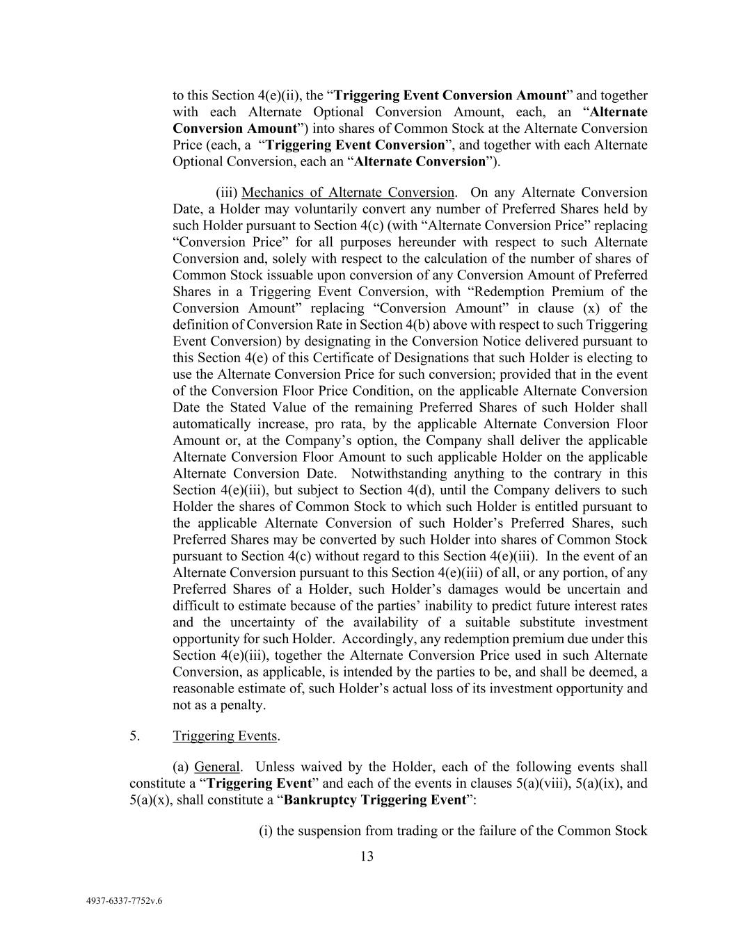 13 4937-6337-7752v.6 to this Section 4(e)(ii), the “Triggering Event Conversion Amount” and together with each Alternate Optional Conversion Amount, each, an “Alternate Conversion Amount”) into shares of Common Stock at the Alternate Conversion Price (each, a “Triggering Event Conversion”, and together with each Alternate Optional Conversion, each an “Alternate Conversion”). (iii) Mechanics of Alternate Conversion. On any Alternate Conversion Date, a Holder may voluntarily convert any number of Preferred Shares held by such Holder pursuant to Section 4(c) (with “Alternate Conversion Price” replacing “Conversion Price” for all purposes hereunder with respect to such Alternate Conversion and, solely with respect to the calculation of the number of shares of Common Stock issuable upon conversion of any Conversion Amount of Preferred Shares in a Triggering Event Conversion, with “Redemption Premium of the Conversion Amount” replacing “Conversion Amount” in clause (x) of the definition of Conversion Rate in Section 4(b) above with respect to such Triggering Event Conversion) by designating in the Conversion Notice delivered pursuant to this Section 4(e) of this Certificate of Designations that such Holder is electing to use the Alternate Conversion Price for such conversion; provided that in the event of the Conversion Floor Price Condition, on the applicable Alternate Conversion Date the Stated Value of the remaining Preferred Shares of such Holder shall automatically increase, pro rata, by the applicable Alternate Conversion Floor Amount or, at the Company’s option, the Company shall deliver the applicable Alternate Conversion Floor Amount to such applicable Holder on the applicable Alternate Conversion Date. Notwithstanding anything to the contrary in this Section 4(e)(iii), but subject to Section 4(d), until the Company delivers to such Holder the shares of Common Stock to which such Holder is entitled pursuant to the applicable Alternate Conversion of such Holder’s Preferred Shares, such Preferred Shares may be converted by such Holder into shares of Common Stock pursuant to Section 4(c) without regard to this Section 4(e)(iii). In the event of an Alternate Conversion pursuant to this Section 4(e)(iii) of all, or any portion, of any Preferred Shares of a Holder, such Holder’s damages would be uncertain and difficult to estimate because of the parties’ inability to predict future interest rates and the uncertainty of the availability of a suitable substitute investment opportunity for such Holder. Accordingly, any redemption premium due under this Section 4(e)(iii), together the Alternate Conversion Price used in such Alternate Conversion, as applicable, is intended by the parties to be, and shall be deemed, a reasonable estimate of, such Holder’s actual loss of its investment opportunity and not as a penalty. 5. Triggering Events. (a) General. Unless waived by the Holder, each of the following events shall constitute a “Triggering Event” and each of the events in clauses 5(a)(viii), 5(a)(ix), and 5(a)(x), shall constitute a “Bankruptcy Triggering Event”: (i) the suspension from trading or the failure of the Common Stock
