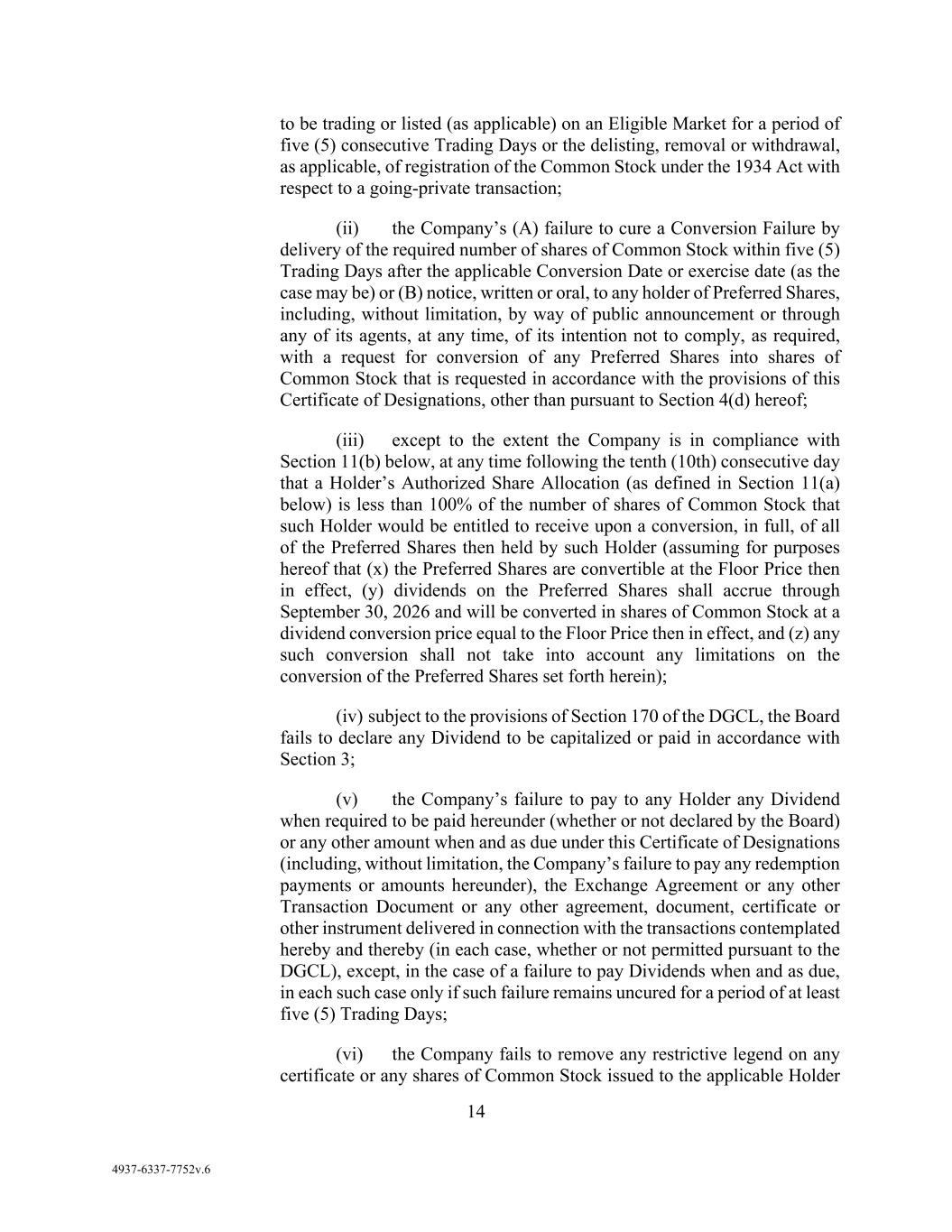 14 4937-6337-7752v.6 to be trading or listed (as applicable) on an Eligible Market for a period of five (5) consecutive Trading Days or the delisting, removal or withdrawal, as applicable, of registration of the Common Stock under the 1934 Act with respect to a going-private transaction; (ii) the Company’s (A) failure to cure a Conversion Failure by delivery of the required number of shares of Common Stock within five (5) Trading Days after the applicable Conversion Date or exercise date (as the case may be) or (B) notice, written or oral, to any holder of Preferred Shares, including, without limitation, by way of public announcement or through any of its agents, at any time, of its intention not to comply, as required, with a request for conversion of any Preferred Shares into shares of Common Stock that is requested in accordance with the provisions of this Certificate of Designations, other than pursuant to Section 4(d) hereof; (iii) except to the extent the Company is in compliance with Section 11(b) below, at any time following the tenth (10th) consecutive day that a Holder’s Authorized Share Allocation (as defined in Section 11(a) below) is less than 100% of the number of shares of Common Stock that such Holder would be entitled to receive upon a conversion, in full, of all of the Preferred Shares then held by such Holder (assuming for purposes hereof that (x) the Preferred Shares are convertible at the Floor Price then in effect, (y) dividends on the Preferred Shares shall accrue through September 30, 2026 and will be converted in shares of Common Stock at a dividend conversion price equal to the Floor Price then in effect, and (z) any such conversion shall not take into account any limitations on the conversion of the Preferred Shares set forth herein); (iv) subject to the provisions of Section 170 of the DGCL, the Board fails to declare any Dividend to be capitalized or paid in accordance with Section 3; (v) the Company’s failure to pay to any Holder any Dividend when required to be paid hereunder (whether or not declared by the Board) or any other amount when and as due under this Certificate of Designations (including, without limitation, the Company’s failure to pay any redemption payments or amounts hereunder), the Exchange Agreement or any other Transaction Document or any other agreement, document, certificate or other instrument delivered in connection with the transactions contemplated hereby and thereby (in each case, whether or not permitted pursuant to the DGCL), except, in the case of a failure to pay Dividends when and as due, in each such case only if such failure remains uncured for a period of at least five (5) Trading Days; (vi) the Company fails to remove any restrictive legend on any certificate or any shares of Common Stock issued to the applicable Holder