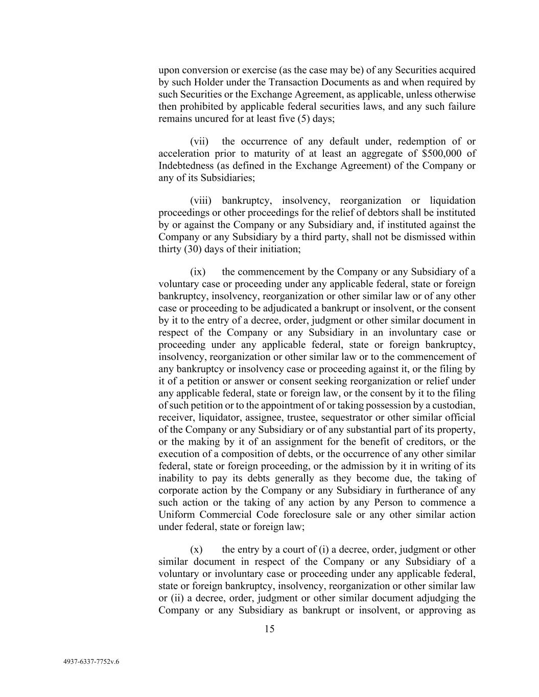 15 4937-6337-7752v.6 upon conversion or exercise (as the case may be) of any Securities acquired by such Holder under the Transaction Documents as and when required by such Securities or the Exchange Agreement, as applicable, unless otherwise then prohibited by applicable federal securities laws, and any such failure remains uncured for at least five (5) days; (vii) the occurrence of any default under, redemption of or acceleration prior to maturity of at least an aggregate of $500,000 of Indebtedness (as defined in the Exchange Agreement) of the Company or any of its Subsidiaries; (viii) bankruptcy, insolvency, reorganization or liquidation proceedings or other proceedings for the relief of debtors shall be instituted by or against the Company or any Subsidiary and, if instituted against the Company or any Subsidiary by a third party, shall not be dismissed within thirty (30) days of their initiation; (ix) the commencement by the Company or any Subsidiary of a voluntary case or proceeding under any applicable federal, state or foreign bankruptcy, insolvency, reorganization or other similar law or of any other case or proceeding to be adjudicated a bankrupt or insolvent, or the consent by it to the entry of a decree, order, judgment or other similar document in respect of the Company or any Subsidiary in an involuntary case or proceeding under any applicable federal, state or foreign bankruptcy, insolvency, reorganization or other similar law or to the commencement of any bankruptcy or insolvency case or proceeding against it, or the filing by it of a petition or answer or consent seeking reorganization or relief under any applicable federal, state or foreign law, or the consent by it to the filing of such petition or to the appointment of or taking possession by a custodian, receiver, liquidator, assignee, trustee, sequestrator or other similar official of the Company or any Subsidiary or of any substantial part of its property, or the making by it of an assignment for the benefit of creditors, or the execution of a composition of debts, or the occurrence of any other similar federal, state or foreign proceeding, or the admission by it in writing of its inability to pay its debts generally as they become due, the taking of corporate action by the Company or any Subsidiary in furtherance of any such action or the taking of any action by any Person to commence a Uniform Commercial Code foreclosure sale or any other similar action under federal, state or foreign law; (x) the entry by a court of (i) a decree, order, judgment or other similar document in respect of the Company or any Subsidiary of a voluntary or involuntary case or proceeding under any applicable federal, state or foreign bankruptcy, insolvency, reorganization or other similar law or (ii) a decree, order, judgment or other similar document adjudging the Company or any Subsidiary as bankrupt or insolvent, or approving as