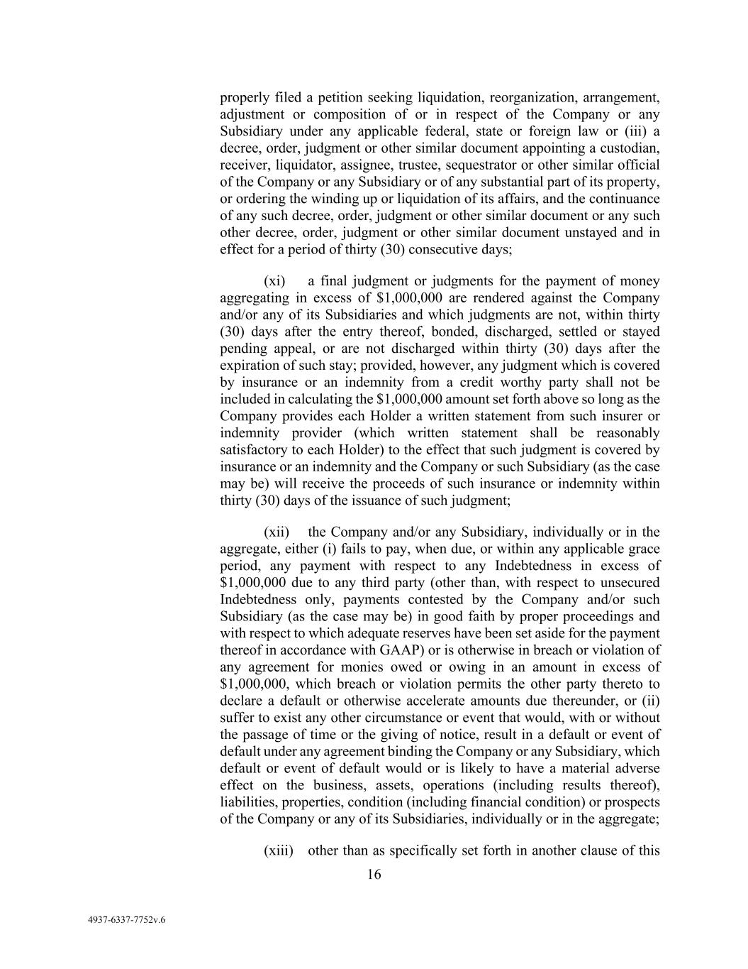 16 4937-6337-7752v.6 properly filed a petition seeking liquidation, reorganization, arrangement, adjustment or composition of or in respect of the Company or any Subsidiary under any applicable federal, state or foreign law or (iii) a decree, order, judgment or other similar document appointing a custodian, receiver, liquidator, assignee, trustee, sequestrator or other similar official of the Company or any Subsidiary or of any substantial part of its property, or ordering the winding up or liquidation of its affairs, and the continuance of any such decree, order, judgment or other similar document or any such other decree, order, judgment or other similar document unstayed and in effect for a period of thirty (30) consecutive days; (xi) a final judgment or judgments for the payment of money aggregating in excess of $1,000,000 are rendered against the Company and/or any of its Subsidiaries and which judgments are not, within thirty (30) days after the entry thereof, bonded, discharged, settled or stayed pending appeal, or are not discharged within thirty (30) days after the expiration of such stay; provided, however, any judgment which is covered by insurance or an indemnity from a credit worthy party shall not be included in calculating the $1,000,000 amount set forth above so long as the Company provides each Holder a written statement from such insurer or indemnity provider (which written statement shall be reasonably satisfactory to each Holder) to the effect that such judgment is covered by insurance or an indemnity and the Company or such Subsidiary (as the case may be) will receive the proceeds of such insurance or indemnity within thirty (30) days of the issuance of such judgment; (xii) the Company and/or any Subsidiary, individually or in the aggregate, either (i) fails to pay, when due, or within any applicable grace period, any payment with respect to any Indebtedness in excess of $1,000,000 due to any third party (other than, with respect to unsecured Indebtedness only, payments contested by the Company and/or such Subsidiary (as the case may be) in good faith by proper proceedings and with respect to which adequate reserves have been set aside for the payment thereof in accordance with GAAP) or is otherwise in breach or violation of any agreement for monies owed or owing in an amount in excess of $1,000,000, which breach or violation permits the other party thereto to declare a default or otherwise accelerate amounts due thereunder, or (ii) suffer to exist any other circumstance or event that would, with or without the passage of time or the giving of notice, result in a default or event of default under any agreement binding the Company or any Subsidiary, which default or event of default would or is likely to have a material adverse effect on the business, assets, operations (including results thereof), liabilities, properties, condition (including financial condition) or prospects of the Company or any of its Subsidiaries, individually or in the aggregate; (xiii) other than as specifically set forth in another clause of this