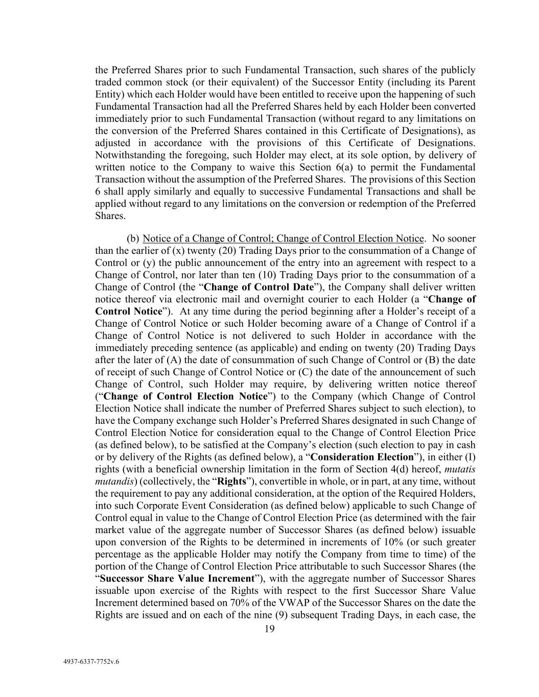 19 4937-6337-7752v.6 the Preferred Shares prior to such Fundamental Transaction, such shares of the publicly traded common stock (or their equivalent) of the Successor Entity (including its Parent Entity) which each Holder would have been entitled to receive upon the happening of such Fundamental Transaction had all the Preferred Shares held by each Holder been converted immediately prior to such Fundamental Transaction (without regard to any limitations on the conversion of the Preferred Shares contained in this Certificate of Designations), as adjusted in accordance with the provisions of this Certificate of Designations. Notwithstanding the foregoing, such Holder may elect, at its sole option, by delivery of written notice to the Company to waive this Section 6(a) to permit the Fundamental Transaction without the assumption of the Preferred Shares. The provisions of this Section 6 shall apply similarly and equally to successive Fundamental Transactions and shall be applied without regard to any limitations on the conversion or redemption of the Preferred Shares. (b) Notice of a Change of Control; Change of Control Election Notice. No sooner than the earlier of (x) twenty (20) Trading Days prior to the consummation of a Change of Control or (y) the public announcement of the entry into an agreement with respect to a Change of Control, nor later than ten (10) Trading Days prior to the consummation of a Change of Control (the “Change of Control Date”), the Company shall deliver written notice thereof via electronic mail and overnight courier to each Holder (a “Change of Control Notice”). At any time during the period beginning after a Holder’s receipt of a Change of Control Notice or such Holder becoming aware of a Change of Control if a Change of Control Notice is not delivered to such Holder in accordance with the immediately preceding sentence (as applicable) and ending on twenty (20) Trading Days after the later of (A) the date of consummation of such Change of Control or (B) the date of receipt of such Change of Control Notice or (C) the date of the announcement of such Change of Control, such Holder may require, by delivering written notice thereof (“Change of Control Election Notice”) to the Company (which Change of Control Election Notice shall indicate the number of Preferred Shares subject to such election), to have the Company exchange such Holder’s Preferred Shares designated in such Change of Control Election Notice for consideration equal to the Change of Control Election Price (as defined below), to be satisfied at the Company’s election (such election to pay in cash or by delivery of the Rights (as defined below), a “Consideration Election”), in either (I) rights (with a beneficial ownership limitation in the form of Section 4(d) hereof, mutatis mutandis) (collectively, the “Rights”), convertible in whole, or in part, at any time, without the requirement to pay any additional consideration, at the option of the Required Holders, into such Corporate Event Consideration (as defined below) applicable to such Change of Control equal in value to the Change of Control Election Price (as determined with the fair market value of the aggregate number of Successor Shares (as defined below) issuable upon conversion of the Rights to be determined in increments of 10% (or such greater percentage as the applicable Holder may notify the Company from time to time) of the portion of the Change of Control Election Price attributable to such Successor Shares (the “Successor Share Value Increment”), with the aggregate number of Successor Shares issuable upon exercise of the Rights with respect to the first Successor Share Value Increment determined based on 70% of the VWAP of the Successor Shares on the date the Rights are issued and on each of the nine (9) subsequent Trading Days, in each case, the