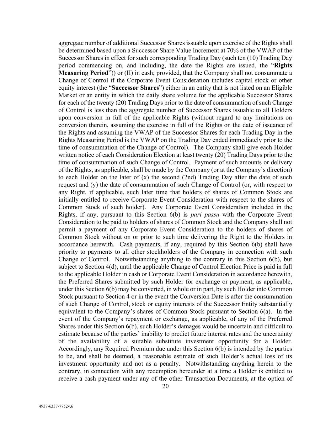 20 4937-6337-7752v.6 aggregate number of additional Successor Shares issuable upon exercise of the Rights shall be determined based upon a Successor Share Value Increment at 70% of the VWAP of the Successor Shares in effect for such corresponding Trading Day (such ten (10) Trading Day period commencing on, and including, the date the Rights are issued, the “Rights Measuring Period”)) or (II) in cash; provided, that the Company shall not consummate a Change of Control if the Corporate Event Consideration includes capital stock or other equity interest (the “Successor Shares”) either in an entity that is not listed on an Eligible Market or an entity in which the daily share volume for the applicable Successor Shares for each of the twenty (20) Trading Days prior to the date of consummation of such Change of Control is less than the aggregate number of Successor Shares issuable to all Holders upon conversion in full of the applicable Rights (without regard to any limitations on conversion therein, assuming the exercise in full of the Rights on the date of issuance of the Rights and assuming the VWAP of the Successor Shares for each Trading Day in the Rights Measuring Period is the VWAP on the Trading Day ended immediately prior to the time of consummation of the Change of Control). The Company shall give each Holder written notice of each Consideration Election at least twenty (20) Trading Days prior to the time of consummation of such Change of Control. Payment of such amounts or delivery of the Rights, as applicable, shall be made by the Company (or at the Company’s direction) to each Holder on the later of (x) the second (2nd) Trading Day after the date of such request and (y) the date of consummation of such Change of Control (or, with respect to any Right, if applicable, such later time that holders of shares of Common Stock are initially entitled to receive Corporate Event Consideration with respect to the shares of Common Stock of such holder). Any Corporate Event Consideration included in the Rights, if any, pursuant to this Section 6(b) is pari passu with the Corporate Event Consideration to be paid to holders of shares of Common Stock and the Company shall not permit a payment of any Corporate Event Consideration to the holders of shares of Common Stock without on or prior to such time delivering the Right to the Holders in accordance herewith. Cash payments, if any, required by this Section 6(b) shall have priority to payments to all other stockholders of the Company in connection with such Change of Control. Notwithstanding anything to the contrary in this Section 6(b), but subject to Section 4(d), until the applicable Change of Control Election Price is paid in full to the applicable Holder in cash or Corporate Event Consideration in accordance herewith, the Preferred Shares submitted by such Holder for exchange or payment, as applicable, under this Section 6(b) may be converted, in whole or in part, by such Holder into Common Stock pursuant to Section 4 or in the event the Conversion Date is after the consummation of such Change of Control, stock or equity interests of the Successor Entity substantially equivalent to the Company’s shares of Common Stock pursuant to Section 6(a). In the event of the Company’s repayment or exchange, as applicable, of any of the Preferred Shares under this Section 6(b), such Holder’s damages would be uncertain and difficult to estimate because of the parties’ inability to predict future interest rates and the uncertainty of the availability of a suitable substitute investment opportunity for a Holder. Accordingly, any Required Premium due under this Section 6(b) is intended by the parties to be, and shall be deemed, a reasonable estimate of such Holder’s actual loss of its investment opportunity and not as a penalty. Notwithstanding anything herein to the contrary, in connection with any redemption hereunder at a time a Holder is entitled to receive a cash payment under any of the other Transaction Documents, at the option of
