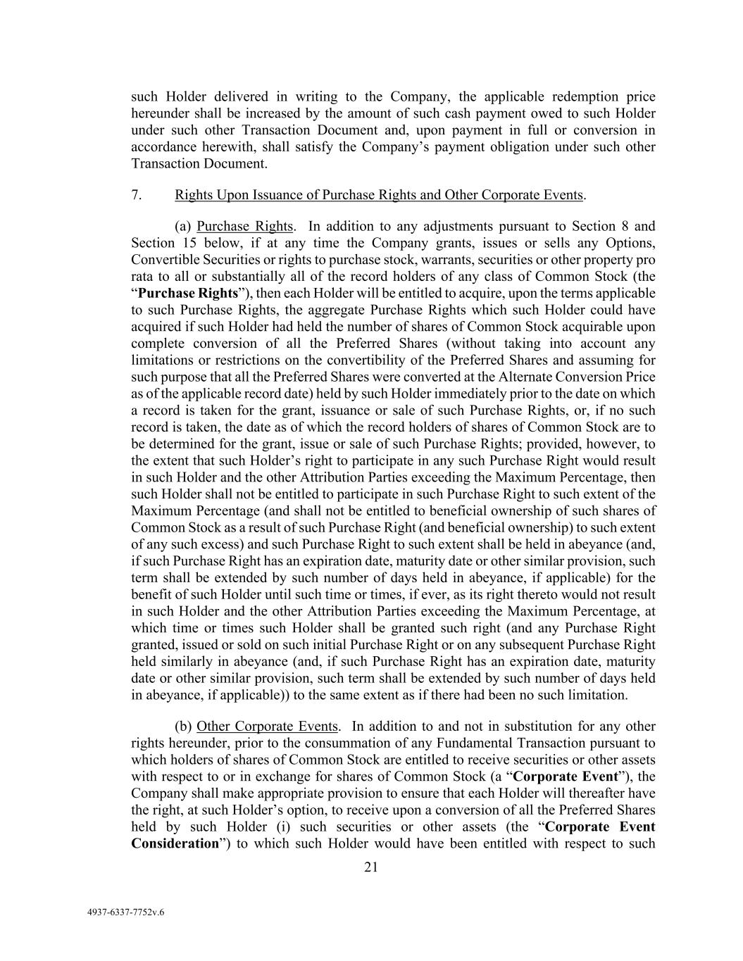 21 4937-6337-7752v.6 such Holder delivered in writing to the Company, the applicable redemption price hereunder shall be increased by the amount of such cash payment owed to such Holder under such other Transaction Document and, upon payment in full or conversion in accordance herewith, shall satisfy the Company’s payment obligation under such other Transaction Document. 7. Rights Upon Issuance of Purchase Rights and Other Corporate Events. (a) Purchase Rights. In addition to any adjustments pursuant to Section 8 and Section 15 below, if at any time the Company grants, issues or sells any Options, Convertible Securities or rights to purchase stock, warrants, securities or other property pro rata to all or substantially all of the record holders of any class of Common Stock (the “Purchase Rights”), then each Holder will be entitled to acquire, upon the terms applicable to such Purchase Rights, the aggregate Purchase Rights which such Holder could have acquired if such Holder had held the number of shares of Common Stock acquirable upon complete conversion of all the Preferred Shares (without taking into account any limitations or restrictions on the convertibility of the Preferred Shares and assuming for such purpose that all the Preferred Shares were converted at the Alternate Conversion Price as of the applicable record date) held by such Holder immediately prior to the date on which a record is taken for the grant, issuance or sale of such Purchase Rights, or, if no such record is taken, the date as of which the record holders of shares of Common Stock are to be determined for the grant, issue or sale of such Purchase Rights; provided, however, to the extent that such Holder’s right to participate in any such Purchase Right would result in such Holder and the other Attribution Parties exceeding the Maximum Percentage, then such Holder shall not be entitled to participate in such Purchase Right to such extent of the Maximum Percentage (and shall not be entitled to beneficial ownership of such shares of Common Stock as a result of such Purchase Right (and beneficial ownership) to such extent of any such excess) and such Purchase Right to such extent shall be held in abeyance (and, if such Purchase Right has an expiration date, maturity date or other similar provision, such term shall be extended by such number of days held in abeyance, if applicable) for the benefit of such Holder until such time or times, if ever, as its right thereto would not result in such Holder and the other Attribution Parties exceeding the Maximum Percentage, at which time or times such Holder shall be granted such right (and any Purchase Right granted, issued or sold on such initial Purchase Right or on any subsequent Purchase Right held similarly in abeyance (and, if such Purchase Right has an expiration date, maturity date or other similar provision, such term shall be extended by such number of days held in abeyance, if applicable)) to the same extent as if there had been no such limitation. (b) Other Corporate Events. In addition to and not in substitution for any other rights hereunder, prior to the consummation of any Fundamental Transaction pursuant to which holders of shares of Common Stock are entitled to receive securities or other assets with respect to or in exchange for shares of Common Stock (a “Corporate Event”), the Company shall make appropriate provision to ensure that each Holder will thereafter have the right, at such Holder’s option, to receive upon a conversion of all the Preferred Shares held by such Holder (i) such securities or other assets (the “Corporate Event Consideration”) to which such Holder would have been entitled with respect to such