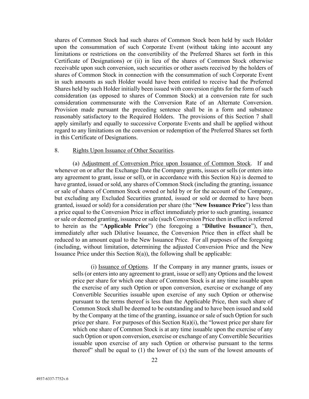 22 4937-6337-7752v.6 shares of Common Stock had such shares of Common Stock been held by such Holder upon the consummation of such Corporate Event (without taking into account any limitations or restrictions on the convertibility of the Preferred Shares set forth in this Certificate of Designations) or (ii) in lieu of the shares of Common Stock otherwise receivable upon such conversion, such securities or other assets received by the holders of shares of Common Stock in connection with the consummation of such Corporate Event in such amounts as such Holder would have been entitled to receive had the Preferred Shares held by such Holder initially been issued with conversion rights for the form of such consideration (as opposed to shares of Common Stock) at a conversion rate for such consideration commensurate with the Conversion Rate of an Alternate Conversion. Provision made pursuant the preceding sentence shall be in a form and substance reasonably satisfactory to the Required Holders. The provisions of this Section 7 shall apply similarly and equally to successive Corporate Events and shall be applied without regard to any limitations on the conversion or redemption of the Preferred Shares set forth in this Certificate of Designations. 8. Rights Upon Issuance of Other Securities. (a) Adjustment of Conversion Price upon Issuance of Common Stock. If and whenever on or after the Exchange Date the Company grants, issues or sells (or enters into any agreement to grant, issue or sell), or in accordance with this Section 8(a) is deemed to have granted, issued or sold, any shares of Common Stock (including the granting, issuance or sale of shares of Common Stock owned or held by or for the account of the Company, but excluding any Excluded Securities granted, issued or sold or deemed to have been granted, issued or sold) for a consideration per share (the “New Issuance Price”) less than a price equal to the Conversion Price in effect immediately prior to such granting, issuance or sale or deemed granting, issuance or sale (such Conversion Price then in effect is referred to herein as the “Applicable Price”) (the foregoing a “Dilutive Issuance”), then, immediately after such Dilutive Issuance, the Conversion Price then in effect shall be reduced to an amount equal to the New Issuance Price. For all purposes of the foregoing (including, without limitation, determining the adjusted Conversion Price and the New Issuance Price under this Section 8(a)), the following shall be applicable: (i) Issuance of Options. If the Company in any manner grants, issues or sells (or enters into any agreement to grant, issue or sell) any Options and the lowest price per share for which one share of Common Stock is at any time issuable upon the exercise of any such Option or upon conversion, exercise or exchange of any Convertible Securities issuable upon exercise of any such Option or otherwise pursuant to the terms thereof is less than the Applicable Price, then such share of Common Stock shall be deemed to be outstanding and to have been issued and sold by the Company at the time of the granting, issuance or sale of such Option for such price per share. For purposes of this Section 8(a)(i), the “lowest price per share for which one share of Common Stock is at any time issuable upon the exercise of any such Option or upon conversion, exercise or exchange of any Convertible Securities issuable upon exercise of any such Option or otherwise pursuant to the terms thereof” shall be equal to (1) the lower of (x) the sum of the lowest amounts of