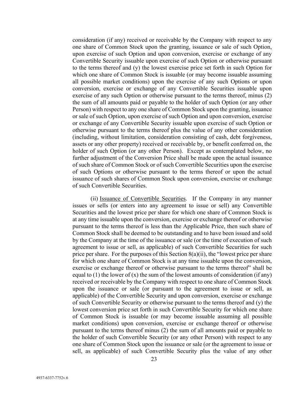 23 4937-6337-7752v.6 consideration (if any) received or receivable by the Company with respect to any one share of Common Stock upon the granting, issuance or sale of such Option, upon exercise of such Option and upon conversion, exercise or exchange of any Convertible Security issuable upon exercise of such Option or otherwise pursuant to the terms thereof and (y) the lowest exercise price set forth in such Option for which one share of Common Stock is issuable (or may become issuable assuming all possible market conditions) upon the exercise of any such Options or upon conversion, exercise or exchange of any Convertible Securities issuable upon exercise of any such Option or otherwise pursuant to the terms thereof, minus (2) the sum of all amounts paid or payable to the holder of such Option (or any other Person) with respect to any one share of Common Stock upon the granting, issuance or sale of such Option, upon exercise of such Option and upon conversion, exercise or exchange of any Convertible Security issuable upon exercise of such Option or otherwise pursuant to the terms thereof plus the value of any other consideration (including, without limitation, consideration consisting of cash, debt forgiveness, assets or any other property) received or receivable by, or benefit conferred on, the holder of such Option (or any other Person). Except as contemplated below, no further adjustment of the Conversion Price shall be made upon the actual issuance of such share of Common Stock or of such Convertible Securities upon the exercise of such Options or otherwise pursuant to the terms thereof or upon the actual issuance of such shares of Common Stock upon conversion, exercise or exchange of such Convertible Securities. (ii) Issuance of Convertible Securities. If the Company in any manner issues or sells (or enters into any agreement to issue or sell) any Convertible Securities and the lowest price per share for which one share of Common Stock is at any time issuable upon the conversion, exercise or exchange thereof or otherwise pursuant to the terms thereof is less than the Applicable Price, then such share of Common Stock shall be deemed to be outstanding and to have been issued and sold by the Company at the time of the issuance or sale (or the time of execution of such agreement to issue or sell, as applicable) of such Convertible Securities for such price per share. For the purposes of this Section 8(a)(ii), the “lowest price per share for which one share of Common Stock is at any time issuable upon the conversion, exercise or exchange thereof or otherwise pursuant to the terms thereof” shall be equal to (1) the lower of (x) the sum of the lowest amounts of consideration (if any) received or receivable by the Company with respect to one share of Common Stock upon the issuance or sale (or pursuant to the agreement to issue or sell, as applicable) of the Convertible Security and upon conversion, exercise or exchange of such Convertible Security or otherwise pursuant to the terms thereof and (y) the lowest conversion price set forth in such Convertible Security for which one share of Common Stock is issuable (or may become issuable assuming all possible market conditions) upon conversion, exercise or exchange thereof or otherwise pursuant to the terms thereof minus (2) the sum of all amounts paid or payable to the holder of such Convertible Security (or any other Person) with respect to any one share of Common Stock upon the issuance or sale (or the agreement to issue or sell, as applicable) of such Convertible Security plus the value of any other