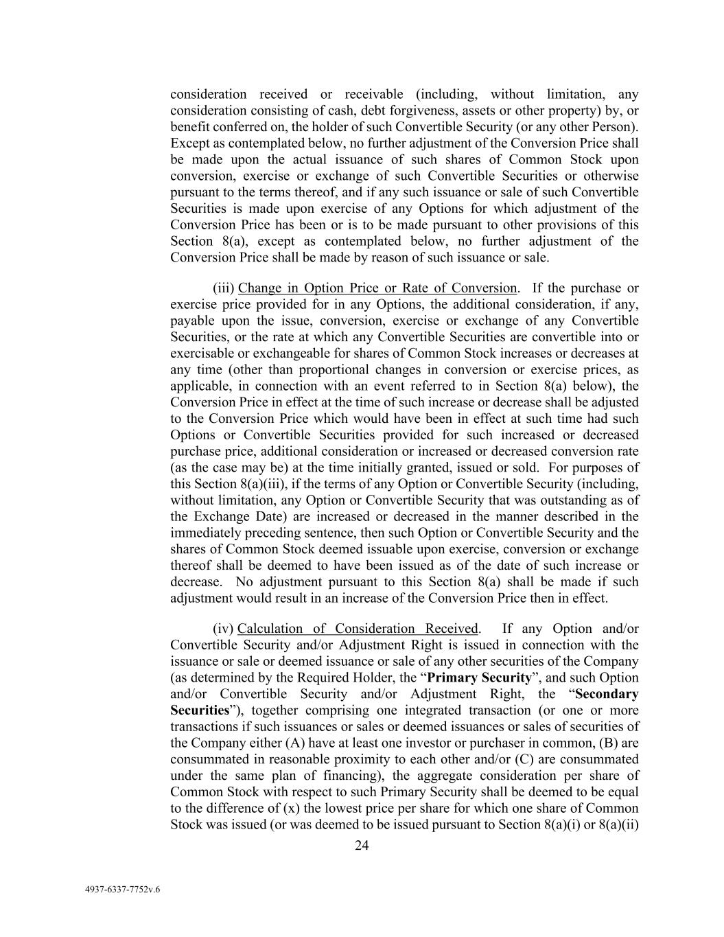 24 4937-6337-7752v.6 consideration received or receivable (including, without limitation, any consideration consisting of cash, debt forgiveness, assets or other property) by, or benefit conferred on, the holder of such Convertible Security (or any other Person). Except as contemplated below, no further adjustment of the Conversion Price shall be made upon the actual issuance of such shares of Common Stock upon conversion, exercise or exchange of such Convertible Securities or otherwise pursuant to the terms thereof, and if any such issuance or sale of such Convertible Securities is made upon exercise of any Options for which adjustment of the Conversion Price has been or is to be made pursuant to other provisions of this Section 8(a), except as contemplated below, no further adjustment of the Conversion Price shall be made by reason of such issuance or sale. (iii) Change in Option Price or Rate of Conversion. If the purchase or exercise price provided for in any Options, the additional consideration, if any, payable upon the issue, conversion, exercise or exchange of any Convertible Securities, or the rate at which any Convertible Securities are convertible into or exercisable or exchangeable for shares of Common Stock increases or decreases at any time (other than proportional changes in conversion or exercise prices, as applicable, in connection with an event referred to in Section 8(a) below), the Conversion Price in effect at the time of such increase or decrease shall be adjusted to the Conversion Price which would have been in effect at such time had such Options or Convertible Securities provided for such increased or decreased purchase price, additional consideration or increased or decreased conversion rate (as the case may be) at the time initially granted, issued or sold. For purposes of this Section 8(a)(iii), if the terms of any Option or Convertible Security (including, without limitation, any Option or Convertible Security that was outstanding as of the Exchange Date) are increased or decreased in the manner described in the immediately preceding sentence, then such Option or Convertible Security and the shares of Common Stock deemed issuable upon exercise, conversion or exchange thereof shall be deemed to have been issued as of the date of such increase or decrease. No adjustment pursuant to this Section 8(a) shall be made if such adjustment would result in an increase of the Conversion Price then in effect. (iv) Calculation of Consideration Received. If any Option and/or Convertible Security and/or Adjustment Right is issued in connection with the issuance or sale or deemed issuance or sale of any other securities of the Company (as determined by the Required Holder, the “Primary Security”, and such Option and/or Convertible Security and/or Adjustment Right, the “Secondary Securities”), together comprising one integrated transaction (or one or more transactions if such issuances or sales or deemed issuances or sales of securities of the Company either (A) have at least one investor or purchaser in common, (B) are consummated in reasonable proximity to each other and/or (C) are consummated under the same plan of financing), the aggregate consideration per share of Common Stock with respect to such Primary Security shall be deemed to be equal to the difference of (x) the lowest price per share for which one share of Common Stock was issued (or was deemed to be issued pursuant to Section 8(a)(i) or 8(a)(ii)