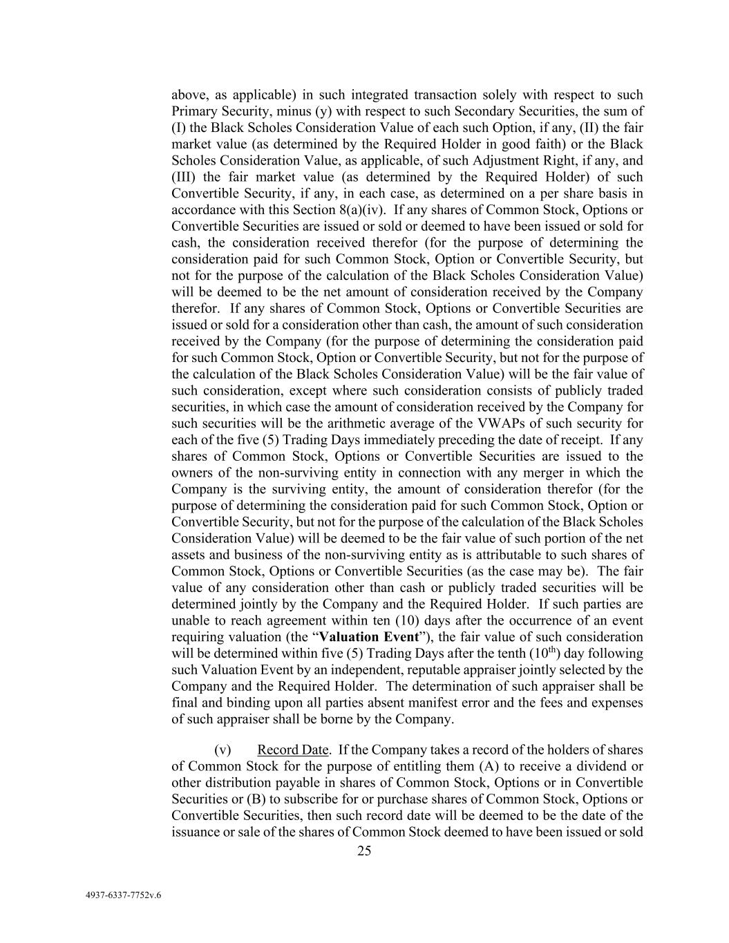 25 4937-6337-7752v.6 above, as applicable) in such integrated transaction solely with respect to such Primary Security, minus (y) with respect to such Secondary Securities, the sum of (I) the Black Scholes Consideration Value of each such Option, if any, (II) the fair market value (as determined by the Required Holder in good faith) or the Black Scholes Consideration Value, as applicable, of such Adjustment Right, if any, and (III) the fair market value (as determined by the Required Holder) of such Convertible Security, if any, in each case, as determined on a per share basis in accordance with this Section 8(a)(iv). If any shares of Common Stock, Options or Convertible Securities are issued or sold or deemed to have been issued or sold for cash, the consideration received therefor (for the purpose of determining the consideration paid for such Common Stock, Option or Convertible Security, but not for the purpose of the calculation of the Black Scholes Consideration Value) will be deemed to be the net amount of consideration received by the Company therefor. If any shares of Common Stock, Options or Convertible Securities are issued or sold for a consideration other than cash, the amount of such consideration received by the Company (for the purpose of determining the consideration paid for such Common Stock, Option or Convertible Security, but not for the purpose of the calculation of the Black Scholes Consideration Value) will be the fair value of such consideration, except where such consideration consists of publicly traded securities, in which case the amount of consideration received by the Company for such securities will be the arithmetic average of the VWAPs of such security for each of the five (5) Trading Days immediately preceding the date of receipt. If any shares of Common Stock, Options or Convertible Securities are issued to the owners of the non-surviving entity in connection with any merger in which the Company is the surviving entity, the amount of consideration therefor (for the purpose of determining the consideration paid for such Common Stock, Option or Convertible Security, but not for the purpose of the calculation of the Black Scholes Consideration Value) will be deemed to be the fair value of such portion of the net assets and business of the non-surviving entity as is attributable to such shares of Common Stock, Options or Convertible Securities (as the case may be). The fair value of any consideration other than cash or publicly traded securities will be determined jointly by the Company and the Required Holder. If such parties are unable to reach agreement within ten (10) days after the occurrence of an event requiring valuation (the “Valuation Event”), the fair value of such consideration will be determined within five (5) Trading Days after the tenth (10th) day following such Valuation Event by an independent, reputable appraiser jointly selected by the Company and the Required Holder. The determination of such appraiser shall be final and binding upon all parties absent manifest error and the fees and expenses of such appraiser shall be borne by the Company. (v) Record Date. If the Company takes a record of the holders of shares of Common Stock for the purpose of entitling them (A) to receive a dividend or other distribution payable in shares of Common Stock, Options or in Convertible Securities or (B) to subscribe for or purchase shares of Common Stock, Options or Convertible Securities, then such record date will be deemed to be the date of the issuance or sale of the shares of Common Stock deemed to have been issued or sold