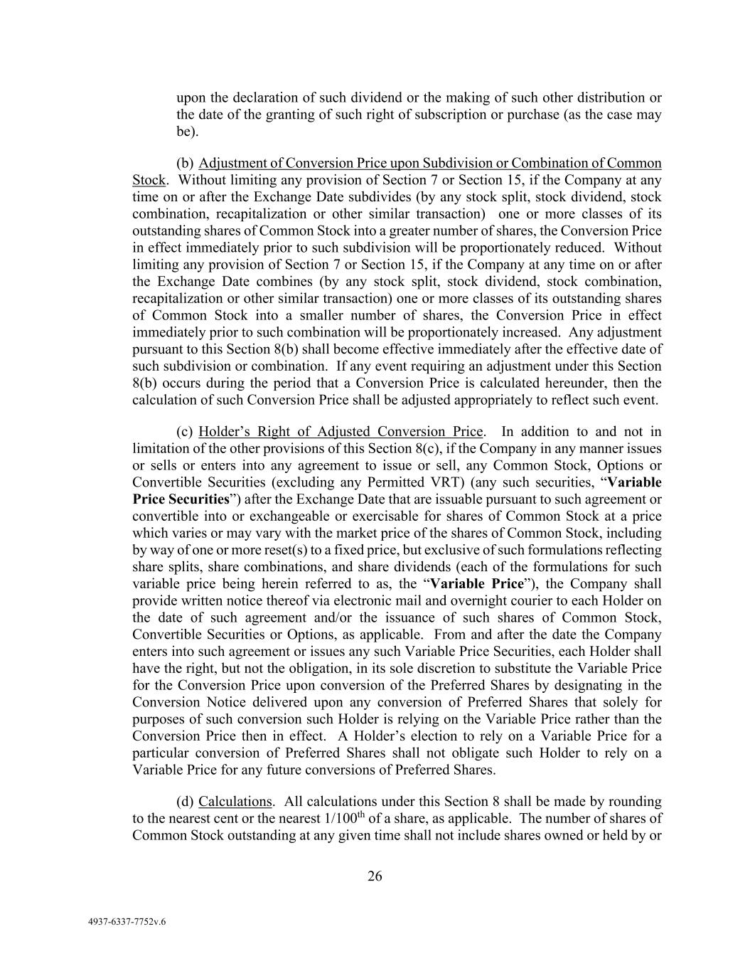 26 4937-6337-7752v.6 upon the declaration of such dividend or the making of such other distribution or the date of the granting of such right of subscription or purchase (as the case may be). (b) Adjustment of Conversion Price upon Subdivision or Combination of Common Stock. Without limiting any provision of Section 7 or Section 15, if the Company at any time on or after the Exchange Date subdivides (by any stock split, stock dividend, stock combination, recapitalization or other similar transaction) one or more classes of its outstanding shares of Common Stock into a greater number of shares, the Conversion Price in effect immediately prior to such subdivision will be proportionately reduced. Without limiting any provision of Section 7 or Section 15, if the Company at any time on or after the Exchange Date combines (by any stock split, stock dividend, stock combination, recapitalization or other similar transaction) one or more classes of its outstanding shares of Common Stock into a smaller number of shares, the Conversion Price in effect immediately prior to such combination will be proportionately increased. Any adjustment pursuant to this Section 8(b) shall become effective immediately after the effective date of such subdivision or combination. If any event requiring an adjustment under this Section 8(b) occurs during the period that a Conversion Price is calculated hereunder, then the calculation of such Conversion Price shall be adjusted appropriately to reflect such event. (c) Holder’s Right of Adjusted Conversion Price. In addition to and not in limitation of the other provisions of this Section 8(c), if the Company in any manner issues or sells or enters into any agreement to issue or sell, any Common Stock, Options or Convertible Securities (excluding any Permitted VRT) (any such securities, “Variable Price Securities”) after the Exchange Date that are issuable pursuant to such agreement or convertible into or exchangeable or exercisable for shares of Common Stock at a price which varies or may vary with the market price of the shares of Common Stock, including by way of one or more reset(s) to a fixed price, but exclusive of such formulations reflecting share splits, share combinations, and share dividends (each of the formulations for such variable price being herein referred to as, the “Variable Price”), the Company shall provide written notice thereof via electronic mail and overnight courier to each Holder on the date of such agreement and/or the issuance of such shares of Common Stock, Convertible Securities or Options, as applicable. From and after the date the Company enters into such agreement or issues any such Variable Price Securities, each Holder shall have the right, but not the obligation, in its sole discretion to substitute the Variable Price for the Conversion Price upon conversion of the Preferred Shares by designating in the Conversion Notice delivered upon any conversion of Preferred Shares that solely for purposes of such conversion such Holder is relying on the Variable Price rather than the Conversion Price then in effect. A Holder’s election to rely on a Variable Price for a particular conversion of Preferred Shares shall not obligate such Holder to rely on a Variable Price for any future conversions of Preferred Shares. (d) Calculations. All calculations under this Section 8 shall be made by rounding to the nearest cent or the nearest 1/100th of a share, as applicable. The number of shares of Common Stock outstanding at any given time shall not include shares owned or held by or