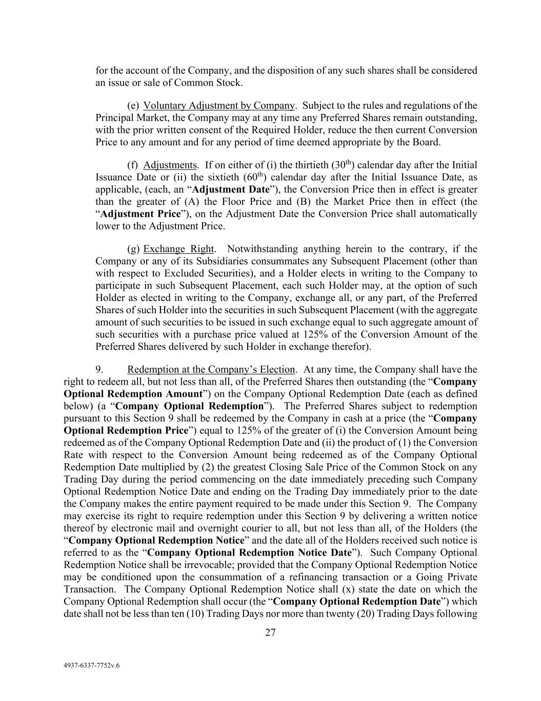 27 4937-6337-7752v.6 for the account of the Company, and the disposition of any such shares shall be considered an issue or sale of Common Stock. (e) Voluntary Adjustment by Company. Subject to the rules and regulations of the Principal Market, the Company may at any time any Preferred Shares remain outstanding, with the prior written consent of the Required Holder, reduce the then current Conversion Price to any amount and for any period of time deemed appropriate by the Board. (f) Adjustments. If on either of (i) the thirtieth (30th) calendar day after the Initial Issuance Date or (ii) the sixtieth (60th) calendar day after the Initial Issuance Date, as applicable, (each, an “Adjustment Date”), the Conversion Price then in effect is greater than the greater of (A) the Floor Price and (B) the Market Price then in effect (the “Adjustment Price”), on the Adjustment Date the Conversion Price shall automatically lower to the Adjustment Price. (g) Exchange Right. Notwithstanding anything herein to the contrary, if the Company or any of its Subsidiaries consummates any Subsequent Placement (other than with respect to Excluded Securities), and a Holder elects in writing to the Company to participate in such Subsequent Placement, each such Holder may, at the option of such Holder as elected in writing to the Company, exchange all, or any part, of the Preferred Shares of such Holder into the securities in such Subsequent Placement (with the aggregate amount of such securities to be issued in such exchange equal to such aggregate amount of such securities with a purchase price valued at 125% of the Conversion Amount of the Preferred Shares delivered by such Holder in exchange therefor). 9. Redemption at the Company’s Election. At any time, the Company shall have the right to redeem all, but not less than all, of the Preferred Shares then outstanding (the “Company Optional Redemption Amount”) on the Company Optional Redemption Date (each as defined below) (a “Company Optional Redemption”). The Preferred Shares subject to redemption pursuant to this Section 9 shall be redeemed by the Company in cash at a price (the “Company Optional Redemption Price”) equal to 125% of the greater of (i) the Conversion Amount being redeemed as of the Company Optional Redemption Date and (ii) the product of (1) the Conversion Rate with respect to the Conversion Amount being redeemed as of the Company Optional Redemption Date multiplied by (2) the greatest Closing Sale Price of the Common Stock on any Trading Day during the period commencing on the date immediately preceding such Company Optional Redemption Notice Date and ending on the Trading Day immediately prior to the date the Company makes the entire payment required to be made under this Section 9. The Company may exercise its right to require redemption under this Section 9 by delivering a written notice thereof by electronic mail and overnight courier to all, but not less than all, of the Holders (the “Company Optional Redemption Notice” and the date all of the Holders received such notice is referred to as the “Company Optional Redemption Notice Date”). Such Company Optional Redemption Notice shall be irrevocable; provided that the Company Optional Redemption Notice may be conditioned upon the consummation of a refinancing transaction or a Going Private Transaction. The Company Optional Redemption Notice shall (x) state the date on which the Company Optional Redemption shall occur (the “Company Optional Redemption Date”) which date shall not be less than ten (10) Trading Days nor more than twenty (20) Trading Days following