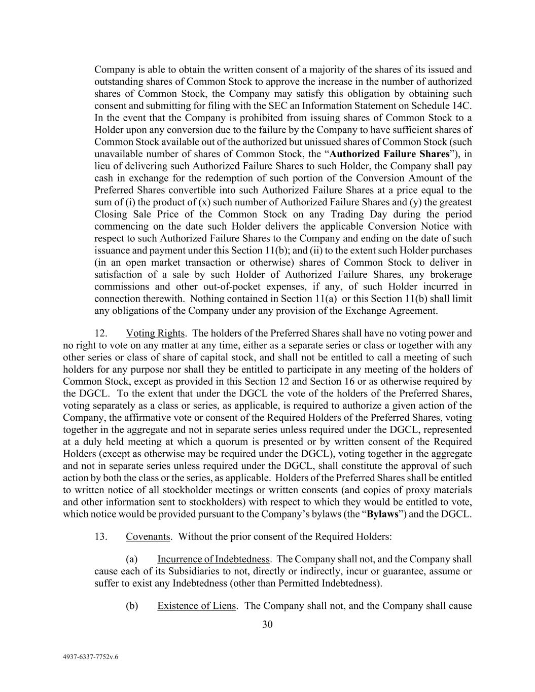30 4937-6337-7752v.6 Company is able to obtain the written consent of a majority of the shares of its issued and outstanding shares of Common Stock to approve the increase in the number of authorized shares of Common Stock, the Company may satisfy this obligation by obtaining such consent and submitting for filing with the SEC an Information Statement on Schedule 14C. In the event that the Company is prohibited from issuing shares of Common Stock to a Holder upon any conversion due to the failure by the Company to have sufficient shares of Common Stock available out of the authorized but unissued shares of Common Stock (such unavailable number of shares of Common Stock, the “Authorized Failure Shares”), in lieu of delivering such Authorized Failure Shares to such Holder, the Company shall pay cash in exchange for the redemption of such portion of the Conversion Amount of the Preferred Shares convertible into such Authorized Failure Shares at a price equal to the sum of (i) the product of (x) such number of Authorized Failure Shares and (y) the greatest Closing Sale Price of the Common Stock on any Trading Day during the period commencing on the date such Holder delivers the applicable Conversion Notice with respect to such Authorized Failure Shares to the Company and ending on the date of such issuance and payment under this Section 11(b); and (ii) to the extent such Holder purchases (in an open market transaction or otherwise) shares of Common Stock to deliver in satisfaction of a sale by such Holder of Authorized Failure Shares, any brokerage commissions and other out-of-pocket expenses, if any, of such Holder incurred in connection therewith. Nothing contained in Section 11(a) or this Section 11(b) shall limit any obligations of the Company under any provision of the Exchange Agreement. 12. Voting Rights. The holders of the Preferred Shares shall have no voting power and no right to vote on any matter at any time, either as a separate series or class or together with any other series or class of share of capital stock, and shall not be entitled to call a meeting of such holders for any purpose nor shall they be entitled to participate in any meeting of the holders of Common Stock, except as provided in this Section 12 and Section 16 or as otherwise required by the DGCL. To the extent that under the DGCL the vote of the holders of the Preferred Shares, voting separately as a class or series, as applicable, is required to authorize a given action of the Company, the affirmative vote or consent of the Required Holders of the Preferred Shares, voting together in the aggregate and not in separate series unless required under the DGCL, represented at a duly held meeting at which a quorum is presented or by written consent of the Required Holders (except as otherwise may be required under the DGCL), voting together in the aggregate and not in separate series unless required under the DGCL, shall constitute the approval of such action by both the class or the series, as applicable. Holders of the Preferred Shares shall be entitled to written notice of all stockholder meetings or written consents (and copies of proxy materials and other information sent to stockholders) with respect to which they would be entitled to vote, which notice would be provided pursuant to the Company’s bylaws (the “Bylaws”) and the DGCL. 13. Covenants. Without the prior consent of the Required Holders: (a) Incurrence of Indebtedness. The Company shall not, and the Company shall cause each of its Subsidiaries to not, directly or indirectly, incur or guarantee, assume or suffer to exist any Indebtedness (other than Permitted Indebtedness). (b) Existence of Liens. The Company shall not, and the Company shall cause