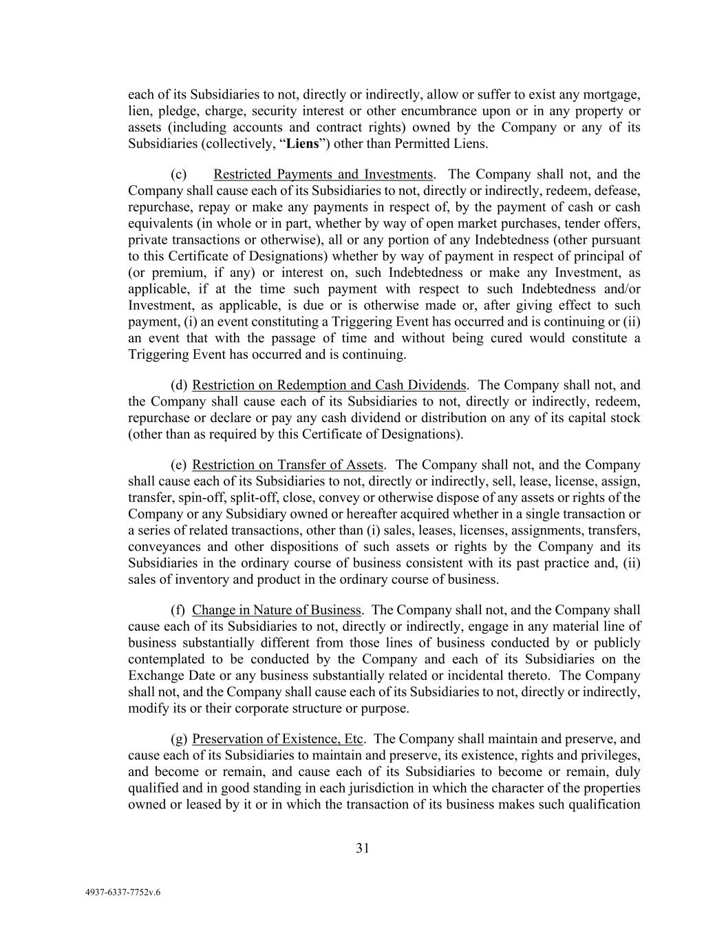 31 4937-6337-7752v.6 each of its Subsidiaries to not, directly or indirectly, allow or suffer to exist any mortgage, lien, pledge, charge, security interest or other encumbrance upon or in any property or assets (including accounts and contract rights) owned by the Company or any of its Subsidiaries (collectively, “Liens”) other than Permitted Liens. (c) Restricted Payments and Investments. The Company shall not, and the Company shall cause each of its Subsidiaries to not, directly or indirectly, redeem, defease, repurchase, repay or make any payments in respect of, by the payment of cash or cash equivalents (in whole or in part, whether by way of open market purchases, tender offers, private transactions or otherwise), all or any portion of any Indebtedness (other pursuant to this Certificate of Designations) whether by way of payment in respect of principal of (or premium, if any) or interest on, such Indebtedness or make any Investment, as applicable, if at the time such payment with respect to such Indebtedness and/or Investment, as applicable, is due or is otherwise made or, after giving effect to such payment, (i) an event constituting a Triggering Event has occurred and is continuing or (ii) an event that with the passage of time and without being cured would constitute a Triggering Event has occurred and is continuing. (d) Restriction on Redemption and Cash Dividends. The Company shall not, and the Company shall cause each of its Subsidiaries to not, directly or indirectly, redeem, repurchase or declare or pay any cash dividend or distribution on any of its capital stock (other than as required by this Certificate of Designations). (e) Restriction on Transfer of Assets. The Company shall not, and the Company shall cause each of its Subsidiaries to not, directly or indirectly, sell, lease, license, assign, transfer, spin-off, split-off, close, convey or otherwise dispose of any assets or rights of the Company or any Subsidiary owned or hereafter acquired whether in a single transaction or a series of related transactions, other than (i) sales, leases, licenses, assignments, transfers, conveyances and other dispositions of such assets or rights by the Company and its Subsidiaries in the ordinary course of business consistent with its past practice and, (ii) sales of inventory and product in the ordinary course of business. (f) Change in Nature of Business. The Company shall not, and the Company shall cause each of its Subsidiaries to not, directly or indirectly, engage in any material line of business substantially different from those lines of business conducted by or publicly contemplated to be conducted by the Company and each of its Subsidiaries on the Exchange Date or any business substantially related or incidental thereto. The Company shall not, and the Company shall cause each of its Subsidiaries to not, directly or indirectly, modify its or their corporate structure or purpose. (g) Preservation of Existence, Etc. The Company shall maintain and preserve, and cause each of its Subsidiaries to maintain and preserve, its existence, rights and privileges, and become or remain, and cause each of its Subsidiaries to become or remain, duly qualified and in good standing in each jurisdiction in which the character of the properties owned or leased by it or in which the transaction of its business makes such qualification