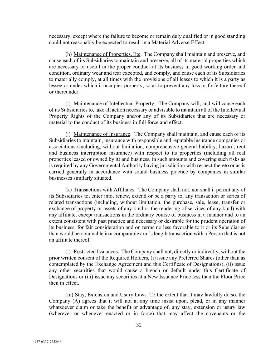 32 4937-6337-7752v.6 necessary, except where the failure to become or remain duly qualified or in good standing could not reasonably be expected to result in a Material Adverse Effect. (h) Maintenance of Properties, Etc. The Company shall maintain and preserve, and cause each of its Subsidiaries to maintain and preserve, all of its material properties which are necessary or useful in the proper conduct of its business in good working order and condition, ordinary wear and tear excepted, and comply, and cause each of its Subsidiaries to materially comply, at all times with the provisions of all leases to which it is a party as lessee or under which it occupies property, so as to prevent any loss or forfeiture thereof or thereunder. (i) Maintenance of Intellectual Property. The Company will, and will cause each of its Subsidiaries to, take all action necessary or advisable to maintain all of the Intellectual Property Rights of the Company and/or any of its Subsidiaries that are necessary or material to the conduct of its business in full force and effect. (j) Maintenance of Insurance. The Company shall maintain, and cause each of its Subsidiaries to maintain, insurance with responsible and reputable insurance companies or associations (including, without limitation, comprehensive general liability, hazard, rent and business interruption insurance) with respect to its properties (including all real properties leased or owned by it) and business, in such amounts and covering such risks as is required by any Governmental Authority having jurisdiction with respect thereto or as is carried generally in accordance with sound business practice by companies in similar businesses similarly situated. (k) Transactions with Affiliates. The Company shall not, nor shall it permit any of its Subsidiaries to, enter into, renew, extend or be a party to, any transaction or series of related transactions (including, without limitation, the purchase, sale, lease, transfer or exchange of property or assets of any kind or the rendering of services of any kind) with any affiliate, except transactions in the ordinary course of business in a manner and to an extent consistent with past practice and necessary or desirable for the prudent operation of its business, for fair consideration and on terms no less favorable to it or its Subsidiaries than would be obtainable in a comparable arm’s length transaction with a Person that is not an affiliate thereof. (l) Restricted Issuances. The Company shall not, directly or indirectly, without the prior written consent of the Required Holders, (i) issue any Preferred Shares (other than as contemplated by the Exchange Agreement and this Certificate of Designations), (ii) issue any other securities that would cause a breach or default under this Certificate of Designations or (iii) issue any securities at a New Issuance Price less than the Floor Price then in effect. (m) Stay, Extension and Usury Laws. To the extent that it may lawfully do so, the Company (A) agrees that it will not at any time insist upon, plead, or in any manner whatsoever claim or take the benefit or advantage of, any stay, extension or usury law (wherever or whenever enacted or in force) that may affect the covenants or the