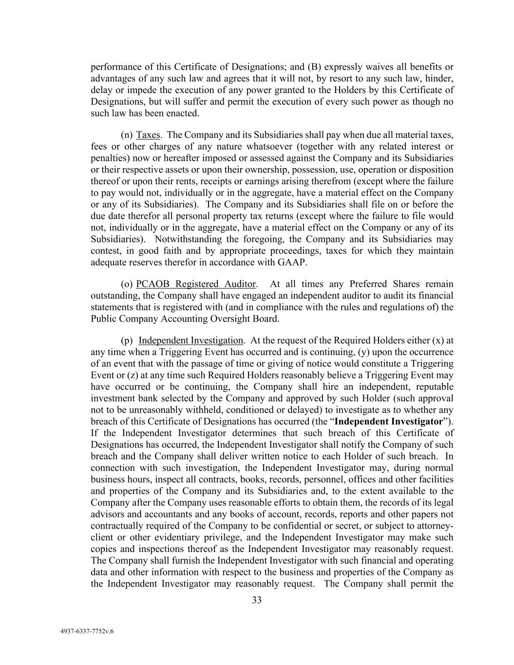 33 4937-6337-7752v.6 performance of this Certificate of Designations; and (B) expressly waives all benefits or advantages of any such law and agrees that it will not, by resort to any such law, hinder, delay or impede the execution of any power granted to the Holders by this Certificate of Designations, but will suffer and permit the execution of every such power as though no such law has been enacted. (n) Taxes. The Company and its Subsidiaries shall pay when due all material taxes, fees or other charges of any nature whatsoever (together with any related interest or penalties) now or hereafter imposed or assessed against the Company and its Subsidiaries or their respective assets or upon their ownership, possession, use, operation or disposition thereof or upon their rents, receipts or earnings arising therefrom (except where the failure to pay would not, individually or in the aggregate, have a material effect on the Company or any of its Subsidiaries). The Company and its Subsidiaries shall file on or before the due date therefor all personal property tax returns (except where the failure to file would not, individually or in the aggregate, have a material effect on the Company or any of its Subsidiaries). Notwithstanding the foregoing, the Company and its Subsidiaries may contest, in good faith and by appropriate proceedings, taxes for which they maintain adequate reserves therefor in accordance with GAAP. (o) PCAOB Registered Auditor. At all times any Preferred Shares remain outstanding, the Company shall have engaged an independent auditor to audit its financial statements that is registered with (and in compliance with the rules and regulations of) the Public Company Accounting Oversight Board. (p) Independent Investigation. At the request of the Required Holders either (x) at any time when a Triggering Event has occurred and is continuing, (y) upon the occurrence of an event that with the passage of time or giving of notice would constitute a Triggering Event or (z) at any time such Required Holders reasonably believe a Triggering Event may have occurred or be continuing, the Company shall hire an independent, reputable investment bank selected by the Company and approved by such Holder (such approval not to be unreasonably withheld, conditioned or delayed) to investigate as to whether any breach of this Certificate of Designations has occurred (the “Independent Investigator”). If the Independent Investigator determines that such breach of this Certificate of Designations has occurred, the Independent Investigator shall notify the Company of such breach and the Company shall deliver written notice to each Holder of such breach. In connection with such investigation, the Independent Investigator may, during normal business hours, inspect all contracts, books, records, personnel, offices and other facilities and properties of the Company and its Subsidiaries and, to the extent available to the Company after the Company uses reasonable efforts to obtain them, the records of its legal advisors and accountants and any books of account, records, reports and other papers not contractually required of the Company to be confidential or secret, or subject to attorney- client or other evidentiary privilege, and the Independent Investigator may make such copies and inspections thereof as the Independent Investigator may reasonably request. The Company shall furnish the Independent Investigator with such financial and operating data and other information with respect to the business and properties of the Company as the Independent Investigator may reasonably request. The Company shall permit the
