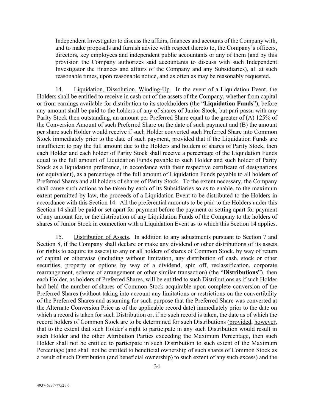 34 4937-6337-7752v.6 Independent Investigator to discuss the affairs, finances and accounts of the Company with, and to make proposals and furnish advice with respect thereto to, the Company’s officers, directors, key employees and independent public accountants or any of them (and by this provision the Company authorizes said accountants to discuss with such Independent Investigator the finances and affairs of the Company and any Subsidiaries), all at such reasonable times, upon reasonable notice, and as often as may be reasonably requested. 14. Liquidation, Dissolution, Winding-Up. In the event of a Liquidation Event, the Holders shall be entitled to receive in cash out of the assets of the Company, whether from capital or from earnings available for distribution to its stockholders (the “Liquidation Funds”), before any amount shall be paid to the holders of any of shares of Junior Stock, but pari passu with any Parity Stock then outstanding, an amount per Preferred Share equal to the greater of (A) 125% of the Conversion Amount of such Preferred Share on the date of such payment and (B) the amount per share such Holder would receive if such Holder converted such Preferred Share into Common Stock immediately prior to the date of such payment, provided that if the Liquidation Funds are insufficient to pay the full amount due to the Holders and holders of shares of Parity Stock, then each Holder and each holder of Parity Stock shall receive a percentage of the Liquidation Funds equal to the full amount of Liquidation Funds payable to such Holder and such holder of Parity Stock as a liquidation preference, in accordance with their respective certificate of designations (or equivalent), as a percentage of the full amount of Liquidation Funds payable to all holders of Preferred Shares and all holders of shares of Parity Stock. To the extent necessary, the Company shall cause such actions to be taken by each of its Subsidiaries so as to enable, to the maximum extent permitted by law, the proceeds of a Liquidation Event to be distributed to the Holders in accordance with this Section 14. All the preferential amounts to be paid to the Holders under this Section 14 shall be paid or set apart for payment before the payment or setting apart for payment of any amount for, or the distribution of any Liquidation Funds of the Company to the holders of shares of Junior Stock in connection with a Liquidation Event as to which this Section 14 applies. 15. Distribution of Assets. In addition to any adjustments pursuant to Section 7 and Section 8, if the Company shall declare or make any dividend or other distributions of its assets (or rights to acquire its assets) to any or all holders of shares of Common Stock, by way of return of capital or otherwise (including without limitation, any distribution of cash, stock or other securities, property or options by way of a dividend, spin off, reclassification, corporate rearrangement, scheme of arrangement or other similar transaction) (the “Distributions”), then each Holder, as holders of Preferred Shares, will be entitled to such Distributions as if such Holder had held the number of shares of Common Stock acquirable upon complete conversion of the Preferred Shares (without taking into account any limitations or restrictions on the convertibility of the Preferred Shares and assuming for such purpose that the Preferred Share was converted at the Alternate Conversion Price as of the applicable record date) immediately prior to the date on which a record is taken for such Distribution or, if no such record is taken, the date as of which the record holders of Common Stock are to be determined for such Distributions (provided, however, that to the extent that such Holder’s right to participate in any such Distribution would result in such Holder and the other Attribution Parties exceeding the Maximum Percentage, then such Holder shall not be entitled to participate in such Distribution to such extent of the Maximum Percentage (and shall not be entitled to beneficial ownership of such shares of Common Stock as a result of such Distribution (and beneficial ownership) to such extent of any such excess) and the