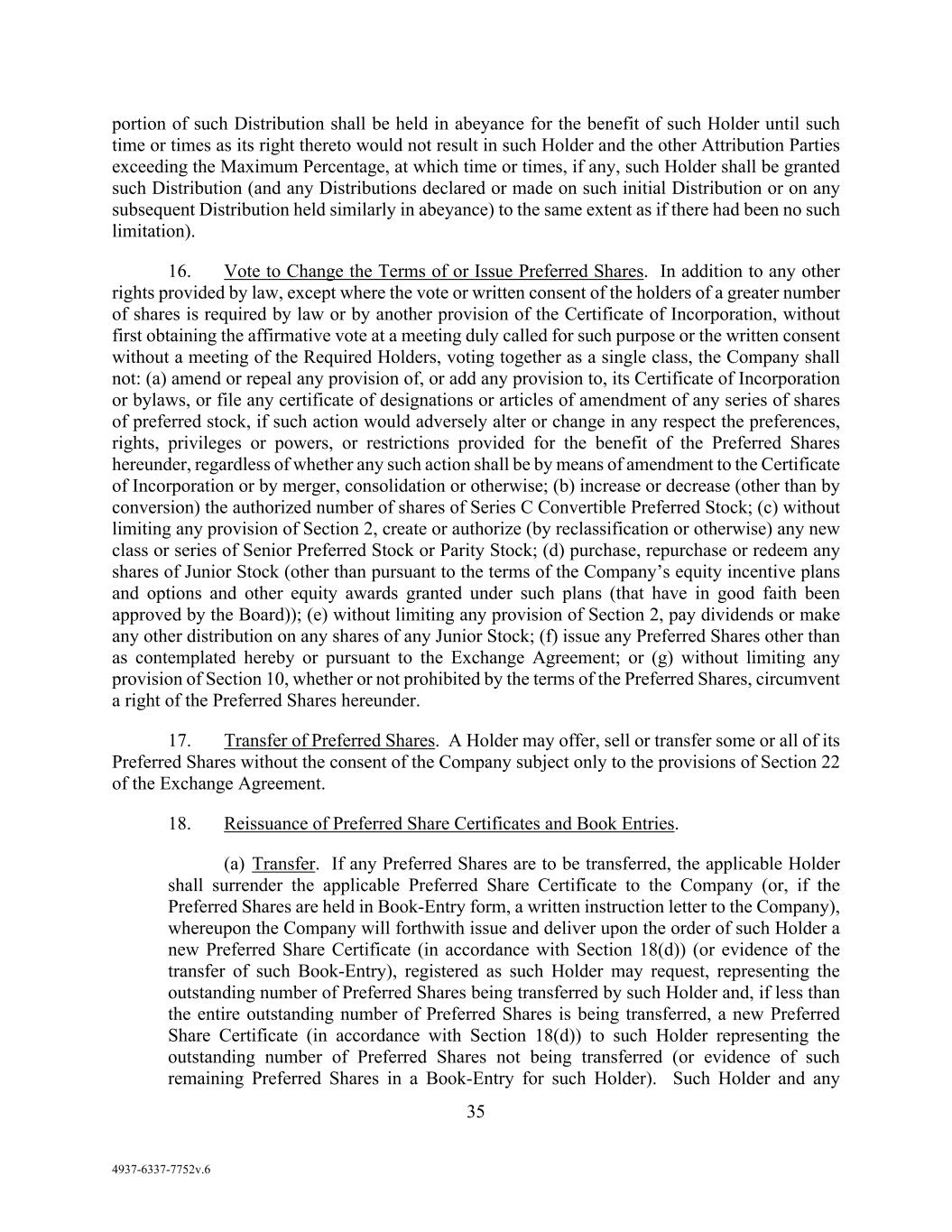 35 4937-6337-7752v.6 portion of such Distribution shall be held in abeyance for the benefit of such Holder until such time or times as its right thereto would not result in such Holder and the other Attribution Parties exceeding the Maximum Percentage, at which time or times, if any, such Holder shall be granted such Distribution (and any Distributions declared or made on such initial Distribution or on any subsequent Distribution held similarly in abeyance) to the same extent as if there had been no such limitation). 16. Vote to Change the Terms of or Issue Preferred Shares. In addition to any other rights provided by law, except where the vote or written consent of the holders of a greater number of shares is required by law or by another provision of the Certificate of Incorporation, without first obtaining the affirmative vote at a meeting duly called for such purpose or the written consent without a meeting of the Required Holders, voting together as a single class, the Company shall not: (a) amend or repeal any provision of, or add any provision to, its Certificate of Incorporation or bylaws, or file any certificate of designations or articles of amendment of any series of shares of preferred stock, if such action would adversely alter or change in any respect the preferences, rights, privileges or powers, or restrictions provided for the benefit of the Preferred Shares hereunder, regardless of whether any such action shall be by means of amendment to the Certificate of Incorporation or by merger, consolidation or otherwise; (b) increase or decrease (other than by conversion) the authorized number of shares of Series C Convertible Preferred Stock; (c) without limiting any provision of Section 2, create or authorize (by reclassification or otherwise) any new class or series of Senior Preferred Stock or Parity Stock; (d) purchase, repurchase or redeem any shares of Junior Stock (other than pursuant to the terms of the Company’s equity incentive plans and options and other equity awards granted under such plans (that have in good faith been approved by the Board)); (e) without limiting any provision of Section 2, pay dividends or make any other distribution on any shares of any Junior Stock; (f) issue any Preferred Shares other than as contemplated hereby or pursuant to the Exchange Agreement; or (g) without limiting any provision of Section 10, whether or not prohibited by the terms of the Preferred Shares, circumvent a right of the Preferred Shares hereunder. 17. Transfer of Preferred Shares. A Holder may offer, sell or transfer some or all of its Preferred Shares without the consent of the Company subject only to the provisions of Section 22 of the Exchange Agreement. 18. Reissuance of Preferred Share Certificates and Book Entries. (a) Transfer. If any Preferred Shares are to be transferred, the applicable Holder shall surrender the applicable Preferred Share Certificate to the Company (or, if the Preferred Shares are held in Book-Entry form, a written instruction letter to the Company), whereupon the Company will forthwith issue and deliver upon the order of such Holder a new Preferred Share Certificate (in accordance with Section 18(d)) (or evidence of the transfer of such Book-Entry), registered as such Holder may request, representing the outstanding number of Preferred Shares being transferred by such Holder and, if less than the entire outstanding number of Preferred Shares is being transferred, a new Preferred Share Certificate (in accordance with Section 18(d)) to such Holder representing the outstanding number of Preferred Shares not being transferred (or evidence of such remaining Preferred Shares in a Book-Entry for such Holder). Such Holder and any