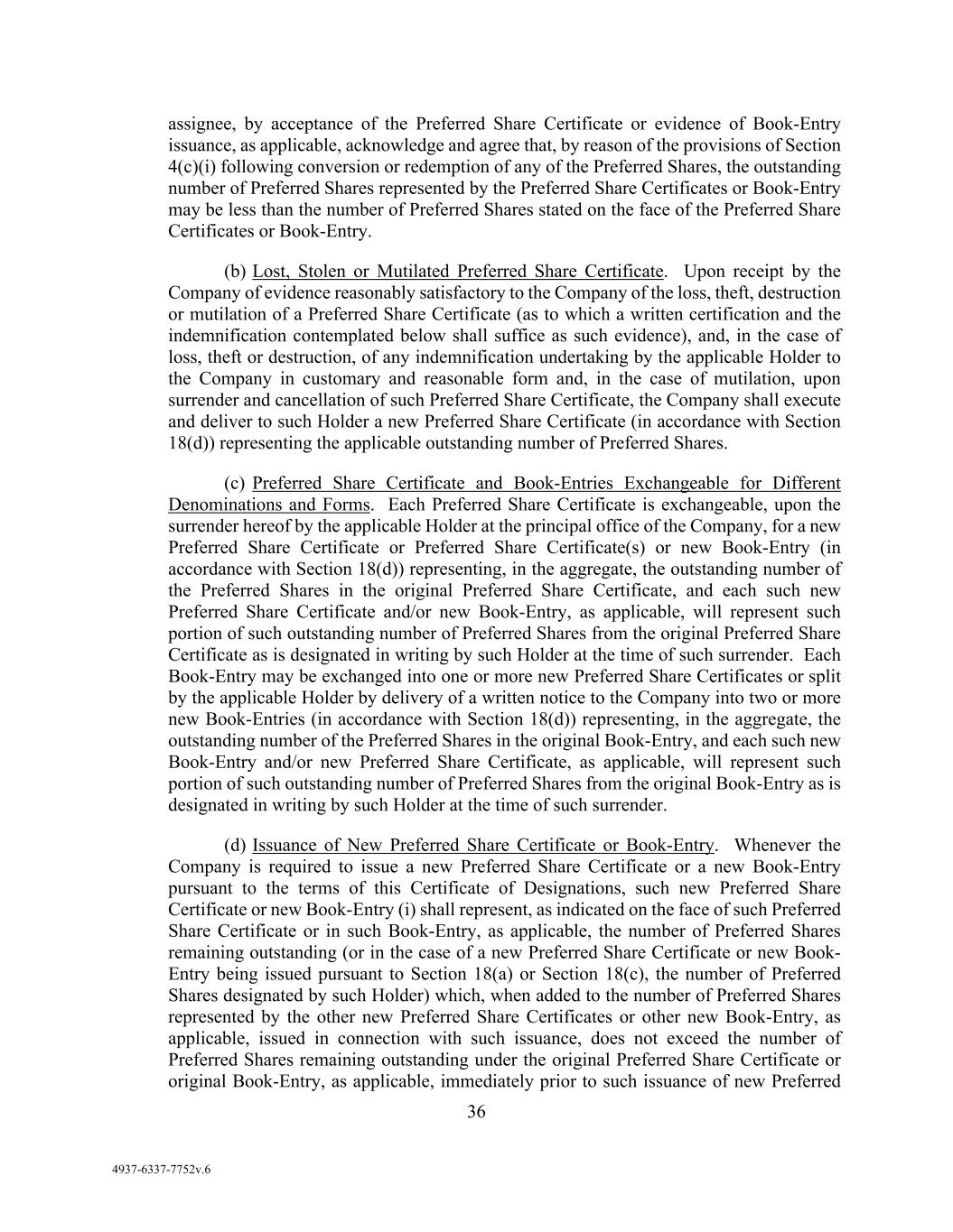 36 4937-6337-7752v.6 assignee, by acceptance of the Preferred Share Certificate or evidence of Book-Entry issuance, as applicable, acknowledge and agree that, by reason of the provisions of Section 4(c)(i) following conversion or redemption of any of the Preferred Shares, the outstanding number of Preferred Shares represented by the Preferred Share Certificates or Book-Entry may be less than the number of Preferred Shares stated on the face of the Preferred Share Certificates or Book-Entry. (b) Lost, Stolen or Mutilated Preferred Share Certificate. Upon receipt by the Company of evidence reasonably satisfactory to the Company of the loss, theft, destruction or mutilation of a Preferred Share Certificate (as to which a written certification and the indemnification contemplated below shall suffice as such evidence), and, in the case of loss, theft or destruction, of any indemnification undertaking by the applicable Holder to the Company in customary and reasonable form and, in the case of mutilation, upon surrender and cancellation of such Preferred Share Certificate, the Company shall execute and deliver to such Holder a new Preferred Share Certificate (in accordance with Section 18(d)) representing the applicable outstanding number of Preferred Shares. (c) Preferred Share Certificate and Book-Entries Exchangeable for Different Denominations and Forms. Each Preferred Share Certificate is exchangeable, upon the surrender hereof by the applicable Holder at the principal office of the Company, for a new Preferred Share Certificate or Preferred Share Certificate(s) or new Book-Entry (in accordance with Section 18(d)) representing, in the aggregate, the outstanding number of the Preferred Shares in the original Preferred Share Certificate, and each such new Preferred Share Certificate and/or new Book-Entry, as applicable, will represent such portion of such outstanding number of Preferred Shares from the original Preferred Share Certificate as is designated in writing by such Holder at the time of such surrender. Each Book-Entry may be exchanged into one or more new Preferred Share Certificates or split by the applicable Holder by delivery of a written notice to the Company into two or more new Book-Entries (in accordance with Section 18(d)) representing, in the aggregate, the outstanding number of the Preferred Shares in the original Book-Entry, and each such new Book-Entry and/or new Preferred Share Certificate, as applicable, will represent such portion of such outstanding number of Preferred Shares from the original Book-Entry as is designated in writing by such Holder at the time of such surrender. (d) Issuance of New Preferred Share Certificate or Book-Entry. Whenever the Company is required to issue a new Preferred Share Certificate or a new Book-Entry pursuant to the terms of this Certificate of Designations, such new Preferred Share Certificate or new Book-Entry (i) shall represent, as indicated on the face of such Preferred Share Certificate or in such Book-Entry, as applicable, the number of Preferred Shares remaining outstanding (or in the case of a new Preferred Share Certificate or new Book- Entry being issued pursuant to Section 18(a) or Section 18(c), the number of Preferred Shares designated by such Holder) which, when added to the number of Preferred Shares represented by the other new Preferred Share Certificates or other new Book-Entry, as applicable, issued in connection with such issuance, does not exceed the number of Preferred Shares remaining outstanding under the original Preferred Share Certificate or original Book-Entry, as applicable, immediately prior to such issuance of new Preferred