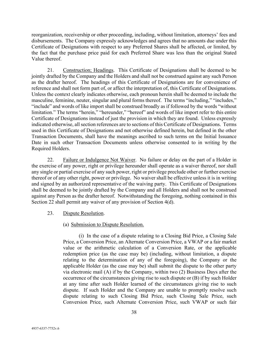 38 4937-6337-7752v.6 reorganization, receivership or other proceeding, including, without limitation, attorneys’ fees and disbursements. The Company expressly acknowledges and agrees that no amounts due under this Certificate of Designations with respect to any Preferred Shares shall be affected, or limited, by the fact that the purchase price paid for each Preferred Share was less than the original Stated Value thereof. 21. Construction; Headings. This Certificate of Designations shall be deemed to be jointly drafted by the Company and the Holders and shall not be construed against any such Person as the drafter hereof. The headings of this Certificate of Designations are for convenience of reference and shall not form part of, or affect the interpretation of, this Certificate of Designations. Unless the context clearly indicates otherwise, each pronoun herein shall be deemed to include the masculine, feminine, neuter, singular and plural forms thereof. The terms “including,” “includes,” “include” and words of like import shall be construed broadly as if followed by the words “without limitation.” The terms “herein,” “hereunder,” “hereof” and words of like import refer to this entire Certificate of Designations instead of just the provision in which they are found. Unless expressly indicated otherwise, all section references are to sections of this Certificate of Designations. Terms used in this Certificate of Designations and not otherwise defined herein, but defined in the other Transaction Documents, shall have the meanings ascribed to such terms on the Initial Issuance Date in such other Transaction Documents unless otherwise consented to in writing by the Required Holders. 22. Failure or Indulgence Not Waiver. No failure or delay on the part of a Holder in the exercise of any power, right or privilege hereunder shall operate as a waiver thereof, nor shall any single or partial exercise of any such power, right or privilege preclude other or further exercise thereof or of any other right, power or privilege. No waiver shall be effective unless it is in writing and signed by an authorized representative of the waiving party. This Certificate of Designations shall be deemed to be jointly drafted by the Company and all Holders and shall not be construed against any Person as the drafter hereof. Notwithstanding the foregoing, nothing contained in this Section 22 shall permit any waiver of any provision of Section 4(d). 23. Dispute Resolution. (a) Submission to Dispute Resolution. (i) In the case of a dispute relating to a Closing Bid Price, a Closing Sale Price, a Conversion Price, an Alternate Conversion Price, a VWAP or a fair market value or the arithmetic calculation of a Conversion Rate, or the applicable redemption price (as the case may be) (including, without limitation, a dispute relating to the determination of any of the foregoing), the Company or the applicable Holder (as the case may be) shall submit the dispute to the other party via electronic mail (A) if by the Company, within two (2) Business Days after the occurrence of the circumstances giving rise to such dispute or (B) if by such Holder at any time after such Holder learned of the circumstances giving rise to such dispute. If such Holder and the Company are unable to promptly resolve such dispute relating to such Closing Bid Price, such Closing Sale Price, such Conversion Price, such Alternate Conversion Price, such VWAP or such fair