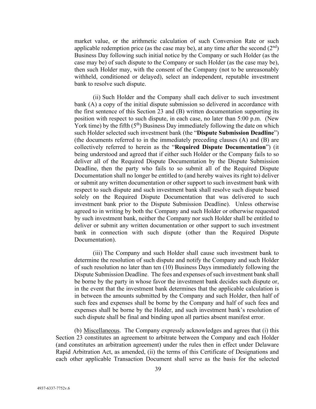 39 4937-6337-7752v.6 market value, or the arithmetic calculation of such Conversion Rate or such applicable redemption price (as the case may be), at any time after the second (2nd) Business Day following such initial notice by the Company or such Holder (as the case may be) of such dispute to the Company or such Holder (as the case may be), then such Holder may, with the consent of the Company (not to be unreasonably withheld, conditioned or delayed), select an independent, reputable investment bank to resolve such dispute. (ii) Such Holder and the Company shall each deliver to such investment bank (A) a copy of the initial dispute submission so delivered in accordance with the first sentence of this Section 23 and (B) written documentation supporting its position with respect to such dispute, in each case, no later than 5:00 p.m. (New York time) by the fifth (5th) Business Day immediately following the date on which such Holder selected such investment bank (the “Dispute Submission Deadline”) (the documents referred to in the immediately preceding clauses (A) and (B) are collectively referred to herein as the “Required Dispute Documentation”) (it being understood and agreed that if either such Holder or the Company fails to so deliver all of the Required Dispute Documentation by the Dispute Submission Deadline, then the party who fails to so submit all of the Required Dispute Documentation shall no longer be entitled to (and hereby waives its right to) deliver or submit any written documentation or other support to such investment bank with respect to such dispute and such investment bank shall resolve such dispute based solely on the Required Dispute Documentation that was delivered to such investment bank prior to the Dispute Submission Deadline). Unless otherwise agreed to in writing by both the Company and such Holder or otherwise requested by such investment bank, neither the Company nor such Holder shall be entitled to deliver or submit any written documentation or other support to such investment bank in connection with such dispute (other than the Required Dispute Documentation). (iii) The Company and such Holder shall cause such investment bank to determine the resolution of such dispute and notify the Company and such Holder of such resolution no later than ten (10) Business Days immediately following the Dispute Submission Deadline. The fees and expenses of such investment bank shall be borne by the party in whose favor the investment bank decides such dispute or, in the event that the investment bank determines that the applicable calculation is in between the amounts submitted by the Company and such Holder, then half of such fees and expenses shall be borne by the Company and half of such fees and expenses shall be borne by the Holder, and such investment bank’s resolution of such dispute shall be final and binding upon all parties absent manifest error. (b) Miscellaneous. The Company expressly acknowledges and agrees that (i) this Section 23 constitutes an agreement to arbitrate between the Company and each Holder (and constitutes an arbitration agreement) under the rules then in effect under Delaware Rapid Arbitration Act, as amended, (ii) the terms of this Certificate of Designations and each other applicable Transaction Document shall serve as the basis for the selected