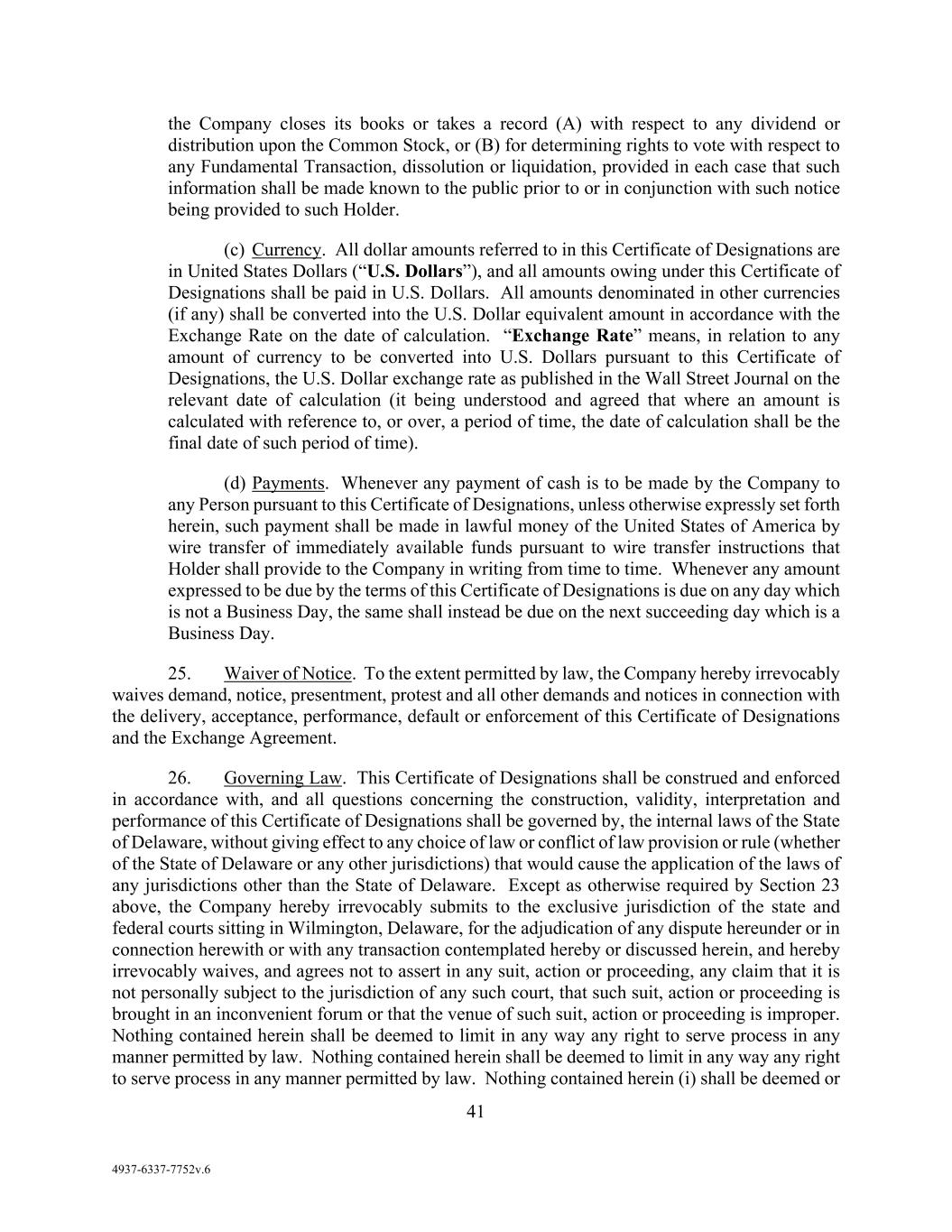 41 4937-6337-7752v.6 the Company closes its books or takes a record (A) with respect to any dividend or distribution upon the Common Stock, or (B) for determining rights to vote with respect to any Fundamental Transaction, dissolution or liquidation, provided in each case that such information shall be made known to the public prior to or in conjunction with such notice being provided to such Holder. (c) Currency. All dollar amounts referred to in this Certificate of Designations are in United States Dollars (“U.S. Dollars”), and all amounts owing under this Certificate of Designations shall be paid in U.S. Dollars. All amounts denominated in other currencies (if any) shall be converted into the U.S. Dollar equivalent amount in accordance with the Exchange Rate on the date of calculation. “Exchange Rate” means, in relation to any amount of currency to be converted into U.S. Dollars pursuant to this Certificate of Designations, the U.S. Dollar exchange rate as published in the Wall Street Journal on the relevant date of calculation (it being understood and agreed that where an amount is calculated with reference to, or over, a period of time, the date of calculation shall be the final date of such period of time). (d) Payments. Whenever any payment of cash is to be made by the Company to any Person pursuant to this Certificate of Designations, unless otherwise expressly set forth herein, such payment shall be made in lawful money of the United States of America by wire transfer of immediately available funds pursuant to wire transfer instructions that Holder shall provide to the Company in writing from time to time. Whenever any amount expressed to be due by the terms of this Certificate of Designations is due on any day which is not a Business Day, the same shall instead be due on the next succeeding day which is a Business Day. 25. Waiver of Notice. To the extent permitted by law, the Company hereby irrevocably waives demand, notice, presentment, protest and all other demands and notices in connection with the delivery, acceptance, performance, default or enforcement of this Certificate of Designations and the Exchange Agreement. 26. Governing Law. This Certificate of Designations shall be construed and enforced in accordance with, and all questions concerning the construction, validity, interpretation and performance of this Certificate of Designations shall be governed by, the internal laws of the State of Delaware, without giving effect to any choice of law or conflict of law provision or rule (whether of the State of Delaware or any other jurisdictions) that would cause the application of the laws of any jurisdictions other than the State of Delaware. Except as otherwise required by Section 23 above, the Company hereby irrevocably submits to the exclusive jurisdiction of the state and federal courts sitting in Wilmington, Delaware, for the adjudication of any dispute hereunder or in connection herewith or with any transaction contemplated hereby or discussed herein, and hereby irrevocably waives, and agrees not to assert in any suit, action or proceeding, any claim that it is not personally subject to the jurisdiction of any such court, that such suit, action or proceeding is brought in an inconvenient forum or that the venue of such suit, action or proceeding is improper. Nothing contained herein shall be deemed to limit in any way any right to serve process in any manner permitted by law. Nothing contained herein shall be deemed to limit in any way any right to serve process in any manner permitted by law. Nothing contained herein (i) shall be deemed or