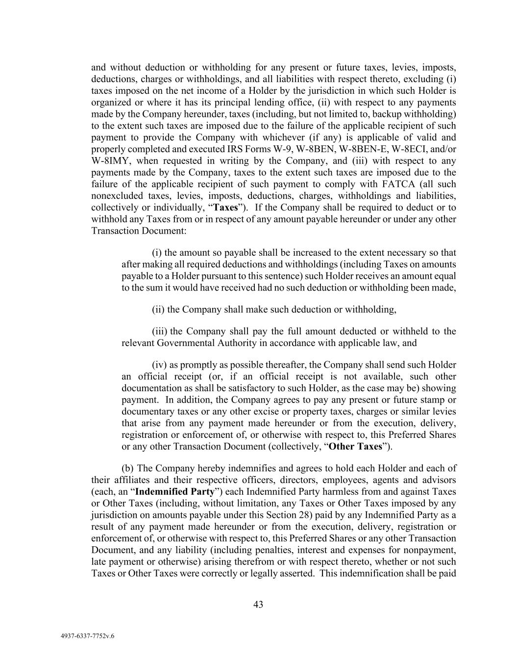 43 4937-6337-7752v.6 and without deduction or withholding for any present or future taxes, levies, imposts, deductions, charges or withholdings, and all liabilities with respect thereto, excluding (i) taxes imposed on the net income of a Holder by the jurisdiction in which such Holder is organized or where it has its principal lending office, (ii) with respect to any payments made by the Company hereunder, taxes (including, but not limited to, backup withholding) to the extent such taxes are imposed due to the failure of the applicable recipient of such payment to provide the Company with whichever (if any) is applicable of valid and properly completed and executed IRS Forms W-9, W-8BEN, W-8BEN-E, W-8ECI, and/or W-8IMY, when requested in writing by the Company, and (iii) with respect to any payments made by the Company, taxes to the extent such taxes are imposed due to the failure of the applicable recipient of such payment to comply with FATCA (all such nonexcluded taxes, levies, imposts, deductions, charges, withholdings and liabilities, collectively or individually, “Taxes”). If the Company shall be required to deduct or to withhold any Taxes from or in respect of any amount payable hereunder or under any other Transaction Document: (i) the amount so payable shall be increased to the extent necessary so that after making all required deductions and withholdings (including Taxes on amounts payable to a Holder pursuant to this sentence) such Holder receives an amount equal to the sum it would have received had no such deduction or withholding been made, (ii) the Company shall make such deduction or withholding, (iii) the Company shall pay the full amount deducted or withheld to the relevant Governmental Authority in accordance with applicable law, and (iv) as promptly as possible thereafter, the Company shall send such Holder an official receipt (or, if an official receipt is not available, such other documentation as shall be satisfactory to such Holder, as the case may be) showing payment. In addition, the Company agrees to pay any present or future stamp or documentary taxes or any other excise or property taxes, charges or similar levies that arise from any payment made hereunder or from the execution, delivery, registration or enforcement of, or otherwise with respect to, this Preferred Shares or any other Transaction Document (collectively, “Other Taxes”). (b) The Company hereby indemnifies and agrees to hold each Holder and each of their affiliates and their respective officers, directors, employees, agents and advisors (each, an “Indemnified Party”) each Indemnified Party harmless from and against Taxes or Other Taxes (including, without limitation, any Taxes or Other Taxes imposed by any jurisdiction on amounts payable under this Section 28) paid by any Indemnified Party as a result of any payment made hereunder or from the execution, delivery, registration or enforcement of, or otherwise with respect to, this Preferred Shares or any other Transaction Document, and any liability (including penalties, interest and expenses for nonpayment, late payment or otherwise) arising therefrom or with respect thereto, whether or not such Taxes or Other Taxes were correctly or legally asserted. This indemnification shall be paid
