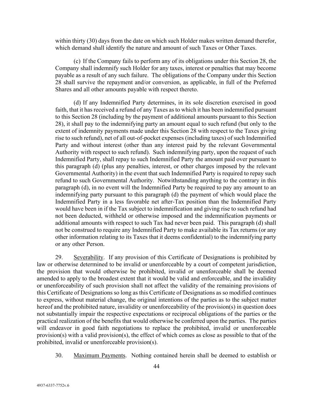 44 4937-6337-7752v.6 within thirty (30) days from the date on which such Holder makes written demand therefor, which demand shall identify the nature and amount of such Taxes or Other Taxes. (c) If the Company fails to perform any of its obligations under this Section 28, the Company shall indemnify such Holder for any taxes, interest or penalties that may become payable as a result of any such failure. The obligations of the Company under this Section 28 shall survive the repayment and/or conversion, as applicable, in full of the Preferred Shares and all other amounts payable with respect thereto. (d) If any Indemnified Party determines, in its sole discretion exercised in good faith, that it has received a refund of any Taxes as to which it has been indemnified pursuant to this Section 28 (including by the payment of additional amounts pursuant to this Section 28), it shall pay to the indemnifying party an amount equal to such refund (but only to the extent of indemnity payments made under this Section 28 with respect to the Taxes giving rise to such refund), net of all out-of-pocket expenses (including taxes) of such Indemnified Party and without interest (other than any interest paid by the relevant Governmental Authority with respect to such refund). Such indemnifying party, upon the request of such Indemnified Party, shall repay to such Indemnified Party the amount paid over pursuant to this paragraph (d) (plus any penalties, interest, or other charges imposed by the relevant Governmental Authority) in the event that such Indemnified Party is required to repay such refund to such Governmental Authority. Notwithstanding anything to the contrary in this paragraph (d), in no event will the Indemnified Party be required to pay any amount to an indemnifying party pursuant to this paragraph (d) the payment of which would place the Indemnified Party in a less favorable net after-Tax position than the Indemnified Party would have been in if the Tax subject to indemnification and giving rise to such refund had not been deducted, withheld or otherwise imposed and the indemnification payments or additional amounts with respect to such Tax had never been paid. This paragraph (d) shall not be construed to require any Indemnified Party to make available its Tax returns (or any other information relating to its Taxes that it deems confidential) to the indemnifying party or any other Person. 29. Severability. If any provision of this Certificate of Designations is prohibited by law or otherwise determined to be invalid or unenforceable by a court of competent jurisdiction, the provision that would otherwise be prohibited, invalid or unenforceable shall be deemed amended to apply to the broadest extent that it would be valid and enforceable, and the invalidity or unenforceability of such provision shall not affect the validity of the remaining provisions of this Certificate of Designations so long as this Certificate of Designations as so modified continues to express, without material change, the original intentions of the parties as to the subject matter hereof and the prohibited nature, invalidity or unenforceability of the provision(s) in question does not substantially impair the respective expectations or reciprocal obligations of the parties or the practical realization of the benefits that would otherwise be conferred upon the parties. The parties will endeavor in good faith negotiations to replace the prohibited, invalid or unenforceable provision(s) with a valid provision(s), the effect of which comes as close as possible to that of the prohibited, invalid or unenforceable provision(s). 30. Maximum Payments. Nothing contained herein shall be deemed to establish or
