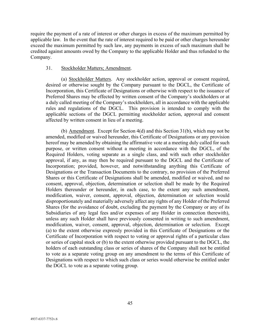 45 4937-6337-7752v.6 require the payment of a rate of interest or other charges in excess of the maximum permitted by applicable law. In the event that the rate of interest required to be paid or other charges hereunder exceed the maximum permitted by such law, any payments in excess of such maximum shall be credited against amounts owed by the Company to the applicable Holder and thus refunded to the Company. 31. Stockholder Matters; Amendment. (a) Stockholder Matters. Any stockholder action, approval or consent required, desired or otherwise sought by the Company pursuant to the DGCL, the Certificate of Incorporation, this Certificate of Designations or otherwise with respect to the issuance of Preferred Shares may be effected by written consent of the Company’s stockholders or at a duly called meeting of the Company’s stockholders, all in accordance with the applicable rules and regulations of the DGCL. This provision is intended to comply with the applicable sections of the DGCL permitting stockholder action, approval and consent affected by written consent in lieu of a meeting. (b) Amendment. Except for Section 4(d) and this Section 31(b), which may not be amended, modified or waived hereunder, this Certificate of Designations or any provision hereof may be amended by obtaining the affirmative vote at a meeting duly called for such purpose, or written consent without a meeting in accordance with the DGCL, of the Required Holders, voting separate as a single class, and with such other stockholder approval, if any, as may then be required pursuant to the DGCL and the Certificate of Incorporation; provided, however, and notwithstanding anything this Certificate of Designations or the Transaction Documents to the contrary, no provision of the Preferred Shares or this Certificate of Designations shall be amended, modified or waived, and no consent, approval, objection, determination or selection shall be made by the Required Holders thereunder or hereunder, in each case, to the extent any such amendment, modification, waiver, consent, approval, objection, determination or selection would disproportionately and materially adversely affect any rights of any Holder of the Preferred Shares (for the avoidance of doubt, excluding the payment by the Company or any of its Subsidiaries of any legal fees and/or expenses of any Holder in connection therewith), unless any such Holder shall have previously consented in writing to such amendment, modification, waiver, consent, approval, objection, determination or selection. Except (a) to the extent otherwise expressly provided in this Certificate of Designations or the Certificate of Incorporation with respect to voting or approval rights of a particular class or series of capital stock or (b) to the extent otherwise provided pursuant to the DGCL, the holders of each outstanding class or series of shares of the Company shall not be entitled to vote as a separate voting group on any amendment to the terms of this Certificate of Designations with respect to which such class or series would otherwise be entitled under the DGCL to vote as a separate voting group.