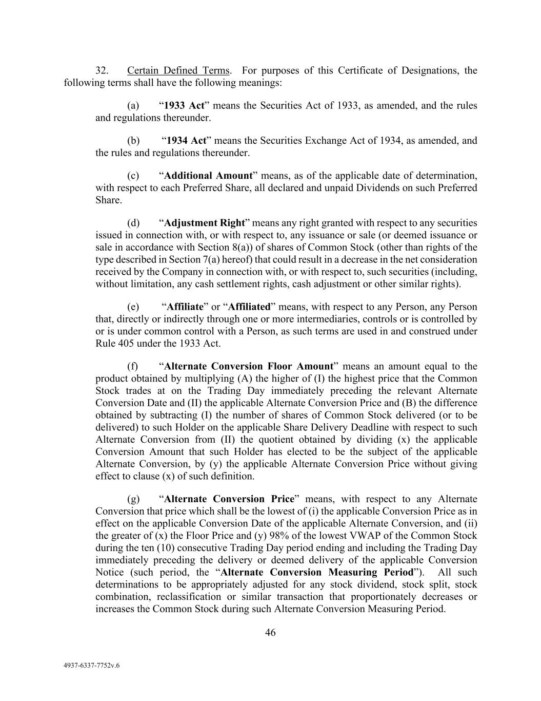 46 4937-6337-7752v.6 32. Certain Defined Terms. For purposes of this Certificate of Designations, the following terms shall have the following meanings: (a) “1933 Act” means the Securities Act of 1933, as amended, and the rules and regulations thereunder. (b) “1934 Act” means the Securities Exchange Act of 1934, as amended, and the rules and regulations thereunder. (c) “Additional Amount” means, as of the applicable date of determination, with respect to each Preferred Share, all declared and unpaid Dividends on such Preferred Share. (d) “Adjustment Right” means any right granted with respect to any securities issued in connection with, or with respect to, any issuance or sale (or deemed issuance or sale in accordance with Section 8(a)) of shares of Common Stock (other than rights of the type described in Section 7(a) hereof) that could result in a decrease in the net consideration received by the Company in connection with, or with respect to, such securities (including, without limitation, any cash settlement rights, cash adjustment or other similar rights). (e) “Affiliate” or “Affiliated” means, with respect to any Person, any Person that, directly or indirectly through one or more intermediaries, controls or is controlled by or is under common control with a Person, as such terms are used in and construed under Rule 405 under the 1933 Act. (f) “Alternate Conversion Floor Amount” means an amount equal to the product obtained by multiplying (A) the higher of (I) the highest price that the Common Stock trades at on the Trading Day immediately preceding the relevant Alternate Conversion Date and (II) the applicable Alternate Conversion Price and (B) the difference obtained by subtracting (I) the number of shares of Common Stock delivered (or to be delivered) to such Holder on the applicable Share Delivery Deadline with respect to such Alternate Conversion from (II) the quotient obtained by dividing (x) the applicable Conversion Amount that such Holder has elected to be the subject of the applicable Alternate Conversion, by (y) the applicable Alternate Conversion Price without giving effect to clause (x) of such definition. (g) “Alternate Conversion Price” means, with respect to any Alternate Conversion that price which shall be the lowest of (i) the applicable Conversion Price as in effect on the applicable Conversion Date of the applicable Alternate Conversion, and (ii) the greater of (x) the Floor Price and (y) 98% of the lowest VWAP of the Common Stock during the ten (10) consecutive Trading Day period ending and including the Trading Day immediately preceding the delivery or deemed delivery of the applicable Conversion Notice (such period, the “Alternate Conversion Measuring Period”). All such determinations to be appropriately adjusted for any stock dividend, stock split, stock combination, reclassification or similar transaction that proportionately decreases or increases the Common Stock during such Alternate Conversion Measuring Period.