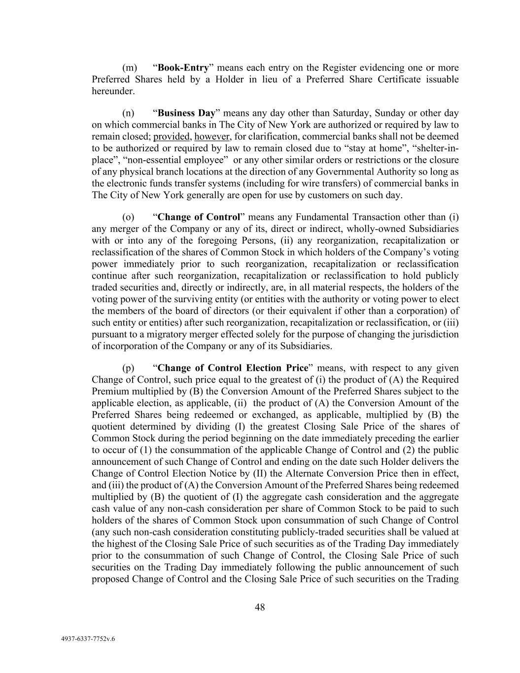 48 4937-6337-7752v.6 (m) “Book-Entry” means each entry on the Register evidencing one or more Preferred Shares held by a Holder in lieu of a Preferred Share Certificate issuable hereunder. (n) “Business Day” means any day other than Saturday, Sunday or other day on which commercial banks in The City of New York are authorized or required by law to remain closed; provided, however, for clarification, commercial banks shall not be deemed to be authorized or required by law to remain closed due to “stay at home”, “shelter-in- place”, “non-essential employee” or any other similar orders or restrictions or the closure of any physical branch locations at the direction of any Governmental Authority so long as the electronic funds transfer systems (including for wire transfers) of commercial banks in The City of New York generally are open for use by customers on such day. (o) “Change of Control” means any Fundamental Transaction other than (i) any merger of the Company or any of its, direct or indirect, wholly-owned Subsidiaries with or into any of the foregoing Persons, (ii) any reorganization, recapitalization or reclassification of the shares of Common Stock in which holders of the Company’s voting power immediately prior to such reorganization, recapitalization or reclassification continue after such reorganization, recapitalization or reclassification to hold publicly traded securities and, directly or indirectly, are, in all material respects, the holders of the voting power of the surviving entity (or entities with the authority or voting power to elect the members of the board of directors (or their equivalent if other than a corporation) of such entity or entities) after such reorganization, recapitalization or reclassification, or (iii) pursuant to a migratory merger effected solely for the purpose of changing the jurisdiction of incorporation of the Company or any of its Subsidiaries. (p) “Change of Control Election Price” means, with respect to any given Change of Control, such price equal to the greatest of (i) the product of (A) the Required Premium multiplied by (B) the Conversion Amount of the Preferred Shares subject to the applicable election, as applicable, (ii) the product of (A) the Conversion Amount of the Preferred Shares being redeemed or exchanged, as applicable, multiplied by (B) the quotient determined by dividing (I) the greatest Closing Sale Price of the shares of Common Stock during the period beginning on the date immediately preceding the earlier to occur of (1) the consummation of the applicable Change of Control and (2) the public announcement of such Change of Control and ending on the date such Holder delivers the Change of Control Election Notice by (II) the Alternate Conversion Price then in effect, and (iii) the product of (A) the Conversion Amount of the Preferred Shares being redeemed multiplied by (B) the quotient of (I) the aggregate cash consideration and the aggregate cash value of any non-cash consideration per share of Common Stock to be paid to such holders of the shares of Common Stock upon consummation of such Change of Control (any such non-cash consideration constituting publicly-traded securities shall be valued at the highest of the Closing Sale Price of such securities as of the Trading Day immediately prior to the consummation of such Change of Control, the Closing Sale Price of such securities on the Trading Day immediately following the public announcement of such proposed Change of Control and the Closing Sale Price of such securities on the Trading