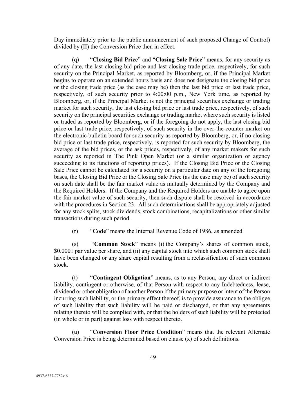 49 4937-6337-7752v.6 Day immediately prior to the public announcement of such proposed Change of Control) divided by (II) the Conversion Price then in effect. (q) “Closing Bid Price” and “Closing Sale Price” means, for any security as of any date, the last closing bid price and last closing trade price, respectively, for such security on the Principal Market, as reported by Bloomberg, or, if the Principal Market begins to operate on an extended hours basis and does not designate the closing bid price or the closing trade price (as the case may be) then the last bid price or last trade price, respectively, of such security prior to 4:00:00 p.m., New York time, as reported by Bloomberg, or, if the Principal Market is not the principal securities exchange or trading market for such security, the last closing bid price or last trade price, respectively, of such security on the principal securities exchange or trading market where such security is listed or traded as reported by Bloomberg, or if the foregoing do not apply, the last closing bid price or last trade price, respectively, of such security in the over-the-counter market on the electronic bulletin board for such security as reported by Bloomberg, or, if no closing bid price or last trade price, respectively, is reported for such security by Bloomberg, the average of the bid prices, or the ask prices, respectively, of any market makers for such security as reported in The Pink Open Market (or a similar organization or agency succeeding to its functions of reporting prices). If the Closing Bid Price or the Closing Sale Price cannot be calculated for a security on a particular date on any of the foregoing bases, the Closing Bid Price or the Closing Sale Price (as the case may be) of such security on such date shall be the fair market value as mutually determined by the Company and the Required Holders. If the Company and the Required Holders are unable to agree upon the fair market value of such security, then such dispute shall be resolved in accordance with the procedures in Section 23. All such determinations shall be appropriately adjusted for any stock splits, stock dividends, stock combinations, recapitalizations or other similar transactions during such period. (r) “Code” means the Internal Revenue Code of 1986, as amended. (s) “Common Stock” means (i) the Company’s shares of common stock, $0.0001 par value per share, and (ii) any capital stock into which such common stock shall have been changed or any share capital resulting from a reclassification of such common stock. (t) “Contingent Obligation” means, as to any Person, any direct or indirect liability, contingent or otherwise, of that Person with respect to any Indebtedness, lease, dividend or other obligation of another Person if the primary purpose or intent of the Person incurring such liability, or the primary effect thereof, is to provide assurance to the obligee of such liability that such liability will be paid or discharged, or that any agreements relating thereto will be complied with, or that the holders of such liability will be protected (in whole or in part) against loss with respect thereto. (u) “Conversion Floor Price Condition” means that the relevant Alternate Conversion Price is being determined based on clause (x) of such definitions.