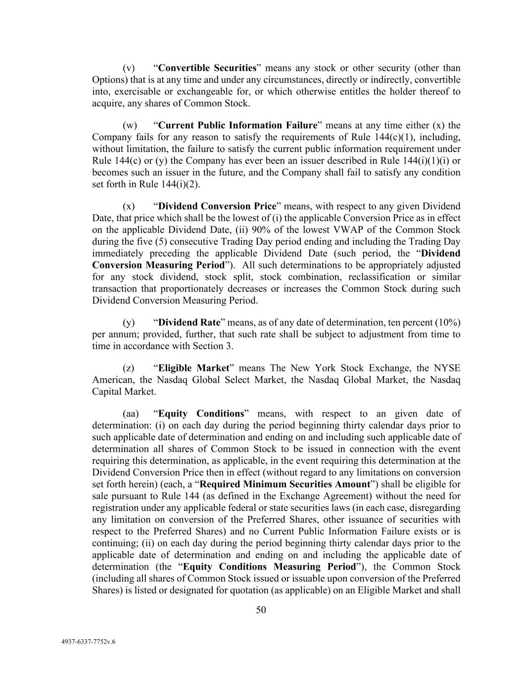 50 4937-6337-7752v.6 (v) “Convertible Securities” means any stock or other security (other than Options) that is at any time and under any circumstances, directly or indirectly, convertible into, exercisable or exchangeable for, or which otherwise entitles the holder thereof to acquire, any shares of Common Stock. (w) “Current Public Information Failure” means at any time either (x) the Company fails for any reason to satisfy the requirements of Rule 144(c)(1), including, without limitation, the failure to satisfy the current public information requirement under Rule 144(c) or (y) the Company has ever been an issuer described in Rule 144(i)(1)(i) or becomes such an issuer in the future, and the Company shall fail to satisfy any condition set forth in Rule 144(i)(2). (x) “Dividend Conversion Price” means, with respect to any given Dividend Date, that price which shall be the lowest of (i) the applicable Conversion Price as in effect on the applicable Dividend Date, (ii) 90% of the lowest VWAP of the Common Stock during the five (5) consecutive Trading Day period ending and including the Trading Day immediately preceding the applicable Dividend Date (such period, the “Dividend Conversion Measuring Period”). All such determinations to be appropriately adjusted for any stock dividend, stock split, stock combination, reclassification or similar transaction that proportionately decreases or increases the Common Stock during such Dividend Conversion Measuring Period. (y) “Dividend Rate” means, as of any date of determination, ten percent (10%) per annum; provided, further, that such rate shall be subject to adjustment from time to time in accordance with Section 3. (z) “Eligible Market” means The New York Stock Exchange, the NYSE American, the Nasdaq Global Select Market, the Nasdaq Global Market, the Nasdaq Capital Market. (aa) “Equity Conditions” means, with respect to an given date of determination: (i) on each day during the period beginning thirty calendar days prior to such applicable date of determination and ending on and including such applicable date of determination all shares of Common Stock to be issued in connection with the event requiring this determination, as applicable, in the event requiring this determination at the Dividend Conversion Price then in effect (without regard to any limitations on conversion set forth herein) (each, a “Required Minimum Securities Amount”) shall be eligible for sale pursuant to Rule 144 (as defined in the Exchange Agreement) without the need for registration under any applicable federal or state securities laws (in each case, disregarding any limitation on conversion of the Preferred Shares, other issuance of securities with respect to the Preferred Shares) and no Current Public Information Failure exists or is continuing; (ii) on each day during the period beginning thirty calendar days prior to the applicable date of determination and ending on and including the applicable date of determination (the “Equity Conditions Measuring Period”), the Common Stock (including all shares of Common Stock issued or issuable upon conversion of the Preferred Shares) is listed or designated for quotation (as applicable) on an Eligible Market and shall
