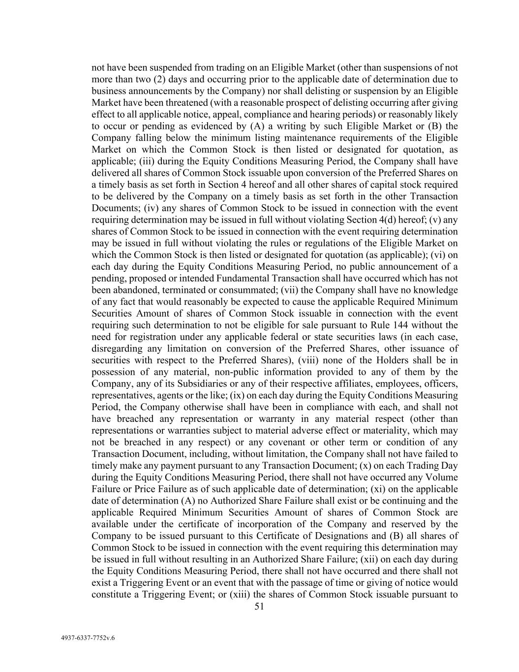 51 4937-6337-7752v.6 not have been suspended from trading on an Eligible Market (other than suspensions of not more than two (2) days and occurring prior to the applicable date of determination due to business announcements by the Company) nor shall delisting or suspension by an Eligible Market have been threatened (with a reasonable prospect of delisting occurring after giving effect to all applicable notice, appeal, compliance and hearing periods) or reasonably likely to occur or pending as evidenced by (A) a writing by such Eligible Market or (B) the Company falling below the minimum listing maintenance requirements of the Eligible Market on which the Common Stock is then listed or designated for quotation, as applicable; (iii) during the Equity Conditions Measuring Period, the Company shall have delivered all shares of Common Stock issuable upon conversion of the Preferred Shares on a timely basis as set forth in Section 4 hereof and all other shares of capital stock required to be delivered by the Company on a timely basis as set forth in the other Transaction Documents; (iv) any shares of Common Stock to be issued in connection with the event requiring determination may be issued in full without violating Section 4(d) hereof; (v) any shares of Common Stock to be issued in connection with the event requiring determination may be issued in full without violating the rules or regulations of the Eligible Market on which the Common Stock is then listed or designated for quotation (as applicable); (vi) on each day during the Equity Conditions Measuring Period, no public announcement of a pending, proposed or intended Fundamental Transaction shall have occurred which has not been abandoned, terminated or consummated; (vii) the Company shall have no knowledge of any fact that would reasonably be expected to cause the applicable Required Minimum Securities Amount of shares of Common Stock issuable in connection with the event requiring such determination to not be eligible for sale pursuant to Rule 144 without the need for registration under any applicable federal or state securities laws (in each case, disregarding any limitation on conversion of the Preferred Shares, other issuance of securities with respect to the Preferred Shares), (viii) none of the Holders shall be in possession of any material, non-public information provided to any of them by the Company, any of its Subsidiaries or any of their respective affiliates, employees, officers, representatives, agents or the like; (ix) on each day during the Equity Conditions Measuring Period, the Company otherwise shall have been in compliance with each, and shall not have breached any representation or warranty in any material respect (other than representations or warranties subject to material adverse effect or materiality, which may not be breached in any respect) or any covenant or other term or condition of any Transaction Document, including, without limitation, the Company shall not have failed to timely make any payment pursuant to any Transaction Document; (x) on each Trading Day during the Equity Conditions Measuring Period, there shall not have occurred any Volume Failure or Price Failure as of such applicable date of determination; (xi) on the applicable date of determination (A) no Authorized Share Failure shall exist or be continuing and the applicable Required Minimum Securities Amount of shares of Common Stock are available under the certificate of incorporation of the Company and reserved by the Company to be issued pursuant to this Certificate of Designations and (B) all shares of Common Stock to be issued in connection with the event requiring this determination may be issued in full without resulting in an Authorized Share Failure; (xii) on each day during the Equity Conditions Measuring Period, there shall not have occurred and there shall not exist a Triggering Event or an event that with the passage of time or giving of notice would constitute a Triggering Event; or (xiii) the shares of Common Stock issuable pursuant to