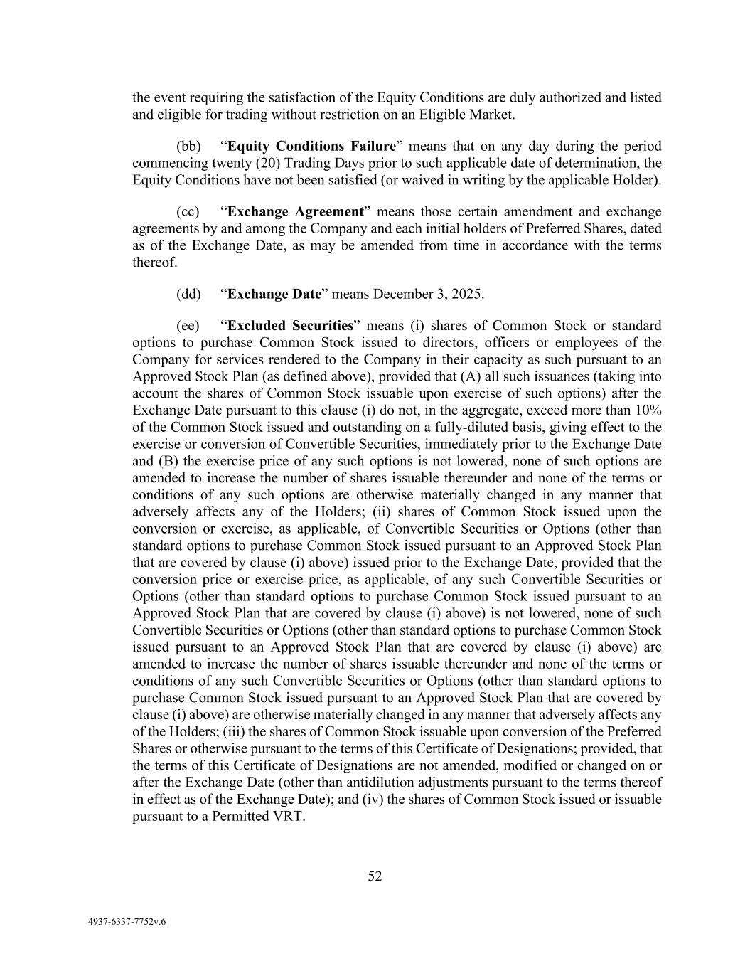 52 4937-6337-7752v.6 the event requiring the satisfaction of the Equity Conditions are duly authorized and listed and eligible for trading without restriction on an Eligible Market. (bb) “Equity Conditions Failure” means that on any day during the period commencing twenty (20) Trading Days prior to such applicable date of determination, the Equity Conditions have not been satisfied (or waived in writing by the applicable Holder). (cc) “Exchange Agreement” means those certain amendment and exchange agreements by and among the Company and each initial holders of Preferred Shares, dated as of the Exchange Date, as may be amended from time in accordance with the terms thereof. (dd) “Exchange Date” means December 3, 2025. (ee) “Excluded Securities” means (i) shares of Common Stock or standard options to purchase Common Stock issued to directors, officers or employees of the Company for services rendered to the Company in their capacity as such pursuant to an Approved Stock Plan (as defined above), provided that (A) all such issuances (taking into account the shares of Common Stock issuable upon exercise of such options) after the Exchange Date pursuant to this clause (i) do not, in the aggregate, exceed more than 10% of the Common Stock issued and outstanding on a fully-diluted basis, giving effect to the exercise or conversion of Convertible Securities, immediately prior to the Exchange Date and (B) the exercise price of any such options is not lowered, none of such options are amended to increase the number of shares issuable thereunder and none of the terms or conditions of any such options are otherwise materially changed in any manner that adversely affects any of the Holders; (ii) shares of Common Stock issued upon the conversion or exercise, as applicable, of Convertible Securities or Options (other than standard options to purchase Common Stock issued pursuant to an Approved Stock Plan that are covered by clause (i) above) issued prior to the Exchange Date, provided that the conversion price or exercise price, as applicable, of any such Convertible Securities or Options (other than standard options to purchase Common Stock issued pursuant to an Approved Stock Plan that are covered by clause (i) above) is not lowered, none of such Convertible Securities or Options (other than standard options to purchase Common Stock issued pursuant to an Approved Stock Plan that are covered by clause (i) above) are amended to increase the number of shares issuable thereunder and none of the terms or conditions of any such Convertible Securities or Options (other than standard options to purchase Common Stock issued pursuant to an Approved Stock Plan that are covered by clause (i) above) are otherwise materially changed in any manner that adversely affects any of the Holders; (iii) the shares of Common Stock issuable upon conversion of the Preferred Shares or otherwise pursuant to the terms of this Certificate of Designations; provided, that the terms of this Certificate of Designations are not amended, modified or changed on or after the Exchange Date (other than antidilution adjustments pursuant to the terms thereof in effect as of the Exchange Date); and (iv) the shares of Common Stock issued or issuable pursuant to a Permitted VRT.