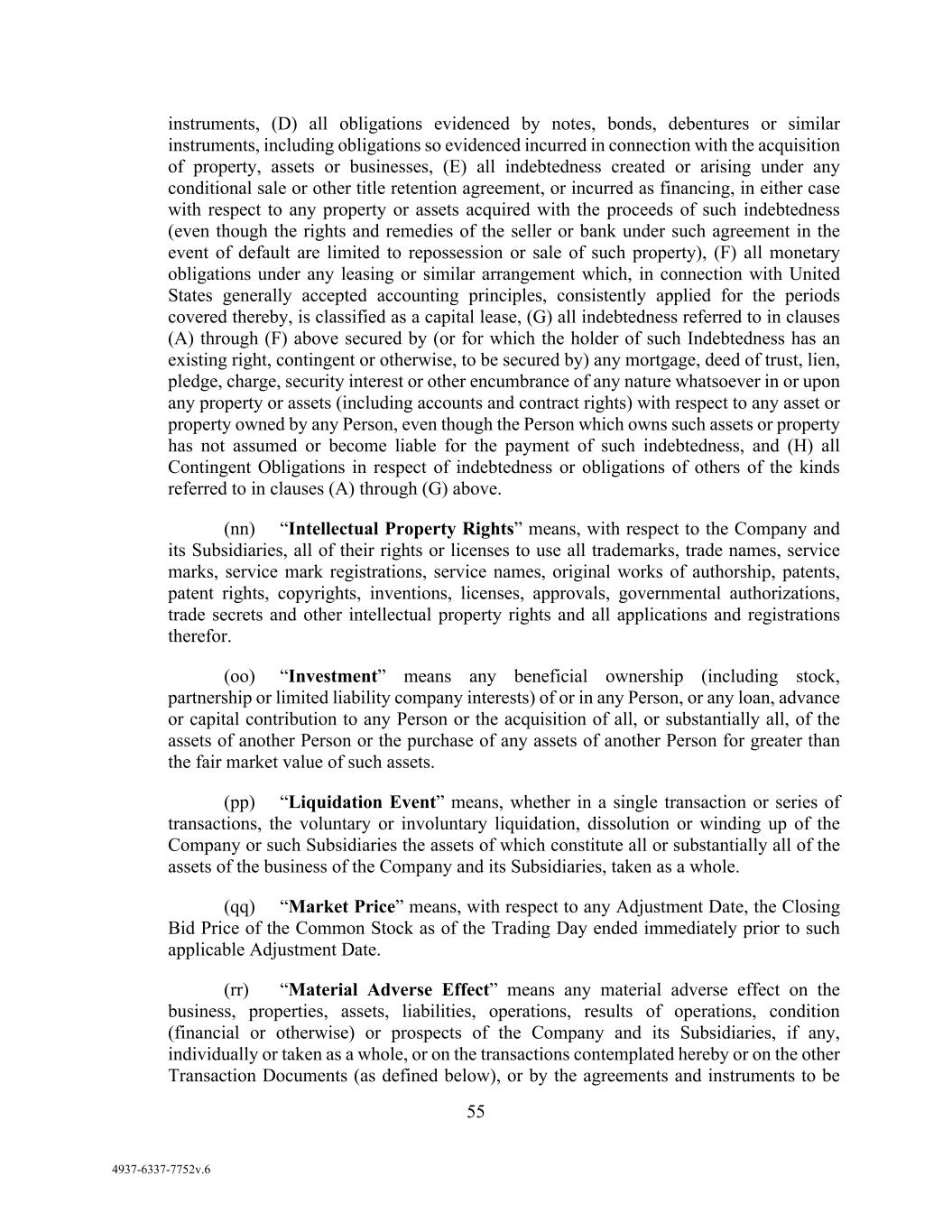 55 4937-6337-7752v.6 instruments, (D) all obligations evidenced by notes, bonds, debentures or similar instruments, including obligations so evidenced incurred in connection with the acquisition of property, assets or businesses, (E) all indebtedness created or arising under any conditional sale or other title retention agreement, or incurred as financing, in either case with respect to any property or assets acquired with the proceeds of such indebtedness (even though the rights and remedies of the seller or bank under such agreement in the event of default are limited to repossession or sale of such property), (F) all monetary obligations under any leasing or similar arrangement which, in connection with United States generally accepted accounting principles, consistently applied for the periods covered thereby, is classified as a capital lease, (G) all indebtedness referred to in clauses (A) through (F) above secured by (or for which the holder of such Indebtedness has an existing right, contingent or otherwise, to be secured by) any mortgage, deed of trust, lien, pledge, charge, security interest or other encumbrance of any nature whatsoever in or upon any property or assets (including accounts and contract rights) with respect to any asset or property owned by any Person, even though the Person which owns such assets or property has not assumed or become liable for the payment of such indebtedness, and (H) all Contingent Obligations in respect of indebtedness or obligations of others of the kinds referred to in clauses (A) through (G) above. (nn) “Intellectual Property Rights” means, with respect to the Company and its Subsidiaries, all of their rights or licenses to use all trademarks, trade names, service marks, service mark registrations, service names, original works of authorship, patents, patent rights, copyrights, inventions, licenses, approvals, governmental authorizations, trade secrets and other intellectual property rights and all applications and registrations therefor. (oo) “Investment” means any beneficial ownership (including stock, partnership or limited liability company interests) of or in any Person, or any loan, advance or capital contribution to any Person or the acquisition of all, or substantially all, of the assets of another Person or the purchase of any assets of another Person for greater than the fair market value of such assets. (pp) “Liquidation Event” means, whether in a single transaction or series of transactions, the voluntary or involuntary liquidation, dissolution or winding up of the Company or such Subsidiaries the assets of which constitute all or substantially all of the assets of the business of the Company and its Subsidiaries, taken as a whole. (qq) “Market Price” means, with respect to any Adjustment Date, the Closing Bid Price of the Common Stock as of the Trading Day ended immediately prior to such applicable Adjustment Date. (rr) “Material Adverse Effect” means any material adverse effect on the business, properties, assets, liabilities, operations, results of operations, condition (financial or otherwise) or prospects of the Company and its Subsidiaries, if any, individually or taken as a whole, or on the transactions contemplated hereby or on the other Transaction Documents (as defined below), or by the agreements and instruments to be