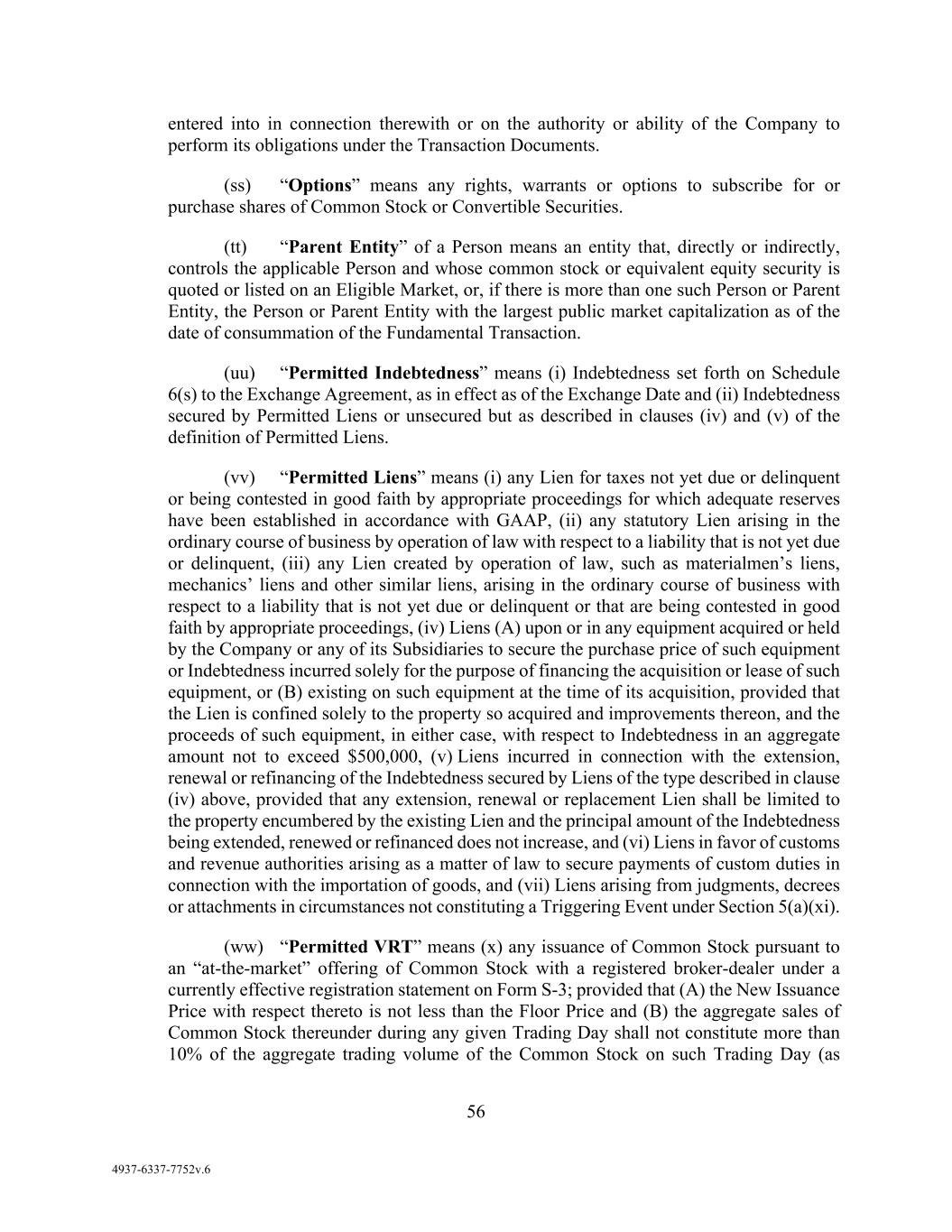 56 4937-6337-7752v.6 entered into in connection therewith or on the authority or ability of the Company to perform its obligations under the Transaction Documents. (ss) “Options” means any rights, warrants or options to subscribe for or purchase shares of Common Stock or Convertible Securities. (tt) “Parent Entity” of a Person means an entity that, directly or indirectly, controls the applicable Person and whose common stock or equivalent equity security is quoted or listed on an Eligible Market, or, if there is more than one such Person or Parent Entity, the Person or Parent Entity with the largest public market capitalization as of the date of consummation of the Fundamental Transaction. (uu) “Permitted Indebtedness” means (i) Indebtedness set forth on Schedule 6(s) to the Exchange Agreement, as in effect as of the Exchange Date and (ii) Indebtedness secured by Permitted Liens or unsecured but as described in clauses (iv) and (v) of the definition of Permitted Liens. (vv) “Permitted Liens” means (i) any Lien for taxes not yet due or delinquent or being contested in good faith by appropriate proceedings for which adequate reserves have been established in accordance with GAAP, (ii) any statutory Lien arising in the ordinary course of business by operation of law with respect to a liability that is not yet due or delinquent, (iii) any Lien created by operation of law, such as materialmen’s liens, mechanics’ liens and other similar liens, arising in the ordinary course of business with respect to a liability that is not yet due or delinquent or that are being contested in good faith by appropriate proceedings, (iv) Liens (A) upon or in any equipment acquired or held by the Company or any of its Subsidiaries to secure the purchase price of such equipment or Indebtedness incurred solely for the purpose of financing the acquisition or lease of such equipment, or (B) existing on such equipment at the time of its acquisition, provided that the Lien is confined solely to the property so acquired and improvements thereon, and the proceeds of such equipment, in either case, with respect to Indebtedness in an aggregate amount not to exceed $500,000, (v) Liens incurred in connection with the extension, renewal or refinancing of the Indebtedness secured by Liens of the type described in clause (iv) above, provided that any extension, renewal or replacement Lien shall be limited to the property encumbered by the existing Lien and the principal amount of the Indebtedness being extended, renewed or refinanced does not increase, and (vi) Liens in favor of customs and revenue authorities arising as a matter of law to secure payments of custom duties in connection with the importation of goods, and (vii) Liens arising from judgments, decrees or attachments in circumstances not constituting a Triggering Event under Section 5(a)(xi). (ww) “Permitted VRT” means (x) any issuance of Common Stock pursuant to an “at-the-market” offering of Common Stock with a registered broker-dealer under a currently effective registration statement on Form S-3; provided that (A) the New Issuance Price with respect thereto is not less than the Floor Price and (B) the aggregate sales of Common Stock thereunder during any given Trading Day shall not constitute more than 10% of the aggregate trading volume of the Common Stock on such Trading Day (as