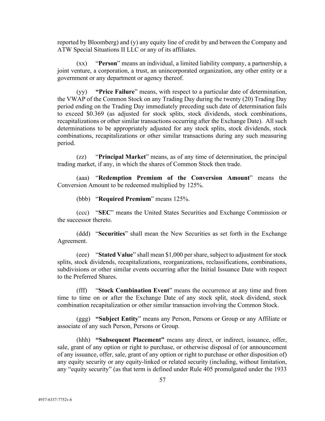 57 4937-6337-7752v.6 reported by Bloomberg) and (y) any equity line of credit by and between the Company and ATW Special Situations II LLC or any of its affiliates. (xx) “Person” means an individual, a limited liability company, a partnership, a joint venture, a corporation, a trust, an unincorporated organization, any other entity or a government or any department or agency thereof. (yy) “Price Failure” means, with respect to a particular date of determination, the VWAP of the Common Stock on any Trading Day during the twenty (20) Trading Day period ending on the Trading Day immediately preceding such date of determination fails to exceed $0.369 (as adjusted for stock splits, stock dividends, stock combinations, recapitalizations or other similar transactions occurring after the Exchange Date). All such determinations to be appropriately adjusted for any stock splits, stock dividends, stock combinations, recapitalizations or other similar transactions during any such measuring period. (zz) “Principal Market” means, as of any time of determination, the principal trading market, if any, in which the shares of Common Stock then trade. (aaa) “Redemption Premium of the Conversion Amount” means the Conversion Amount to be redeemed multiplied by 125%. (bbb) “Required Premium” means 125%. (ccc) “SEC” means the United States Securities and Exchange Commission or the successor thereto. (ddd) “Securities” shall mean the New Securities as set forth in the Exchange Agreement. (eee) “Stated Value” shall mean $1,000 per share, subject to adjustment for stock splits, stock dividends, recapitalizations, reorganizations, reclassifications, combinations, subdivisions or other similar events occurring after the Initial Issuance Date with respect to the Preferred Shares. (fff) “Stock Combination Event” means the occurrence at any time and from time to time on or after the Exchange Date of any stock split, stock dividend, stock combination recapitalization or other similar transaction involving the Common Stock. (ggg) “Subject Entity” means any Person, Persons or Group or any Affiliate or associate of any such Person, Persons or Group. (hhh) “Subsequent Placement” means any direct, or indirect, issuance, offer, sale, grant of any option or right to purchase, or otherwise disposal of (or announcement of any issuance, offer, sale, grant of any option or right to purchase or other disposition of) any equity security or any equity-linked or related security (including, without limitation, any “equity security” (as that term is defined under Rule 405 promulgated under the 1933