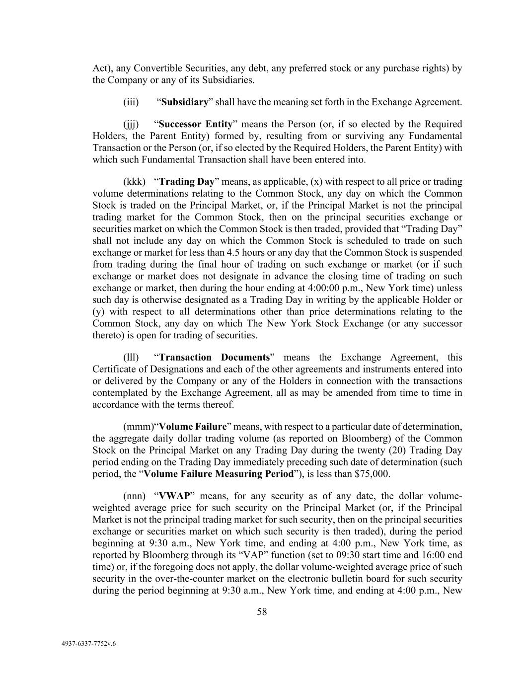 58 4937-6337-7752v.6 Act), any Convertible Securities, any debt, any preferred stock or any purchase rights) by the Company or any of its Subsidiaries. (iii) “Subsidiary” shall have the meaning set forth in the Exchange Agreement. (jjj) “Successor Entity” means the Person (or, if so elected by the Required Holders, the Parent Entity) formed by, resulting from or surviving any Fundamental Transaction or the Person (or, if so elected by the Required Holders, the Parent Entity) with which such Fundamental Transaction shall have been entered into. (kkk) “Trading Day” means, as applicable, (x) with respect to all price or trading volume determinations relating to the Common Stock, any day on which the Common Stock is traded on the Principal Market, or, if the Principal Market is not the principal trading market for the Common Stock, then on the principal securities exchange or securities market on which the Common Stock is then traded, provided that “Trading Day” shall not include any day on which the Common Stock is scheduled to trade on such exchange or market for less than 4.5 hours or any day that the Common Stock is suspended from trading during the final hour of trading on such exchange or market (or if such exchange or market does not designate in advance the closing time of trading on such exchange or market, then during the hour ending at 4:00:00 p.m., New York time) unless such day is otherwise designated as a Trading Day in writing by the applicable Holder or (y) with respect to all determinations other than price determinations relating to the Common Stock, any day on which The New York Stock Exchange (or any successor thereto) is open for trading of securities. (lll) “Transaction Documents” means the Exchange Agreement, this Certificate of Designations and each of the other agreements and instruments entered into or delivered by the Company or any of the Holders in connection with the transactions contemplated by the Exchange Agreement, all as may be amended from time to time in accordance with the terms thereof. (mmm)“Volume Failure” means, with respect to a particular date of determination, the aggregate daily dollar trading volume (as reported on Bloomberg) of the Common Stock on the Principal Market on any Trading Day during the twenty (20) Trading Day period ending on the Trading Day immediately preceding such date of determination (such period, the “Volume Failure Measuring Period”), is less than $75,000. (nnn) “VWAP” means, for any security as of any date, the dollar volume- weighted average price for such security on the Principal Market (or, if the Principal Market is not the principal trading market for such security, then on the principal securities exchange or securities market on which such security is then traded), during the period beginning at 9:30 a.m., New York time, and ending at 4:00 p.m., New York time, as reported by Bloomberg through its “VAP” function (set to 09:30 start time and 16:00 end time) or, if the foregoing does not apply, the dollar volume-weighted average price of such security in the over-the-counter market on the electronic bulletin board for such security during the period beginning at 9:30 a.m., New York time, and ending at 4:00 p.m., New