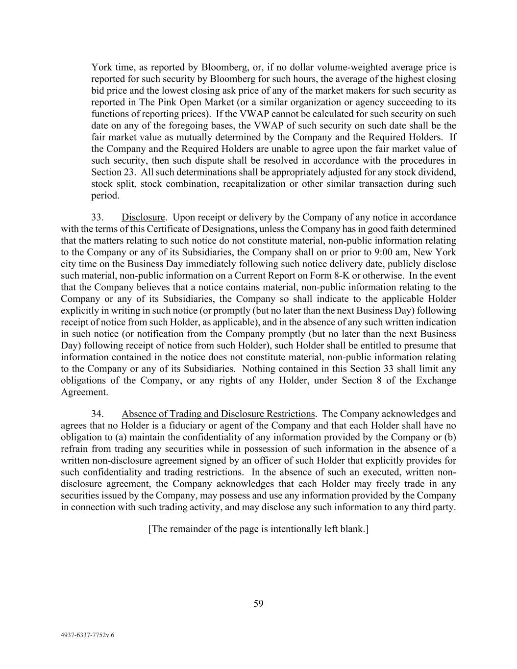 59 4937-6337-7752v.6 York time, as reported by Bloomberg, or, if no dollar volume-weighted average price is reported for such security by Bloomberg for such hours, the average of the highest closing bid price and the lowest closing ask price of any of the market makers for such security as reported in The Pink Open Market (or a similar organization or agency succeeding to its functions of reporting prices). If the VWAP cannot be calculated for such security on such date on any of the foregoing bases, the VWAP of such security on such date shall be the fair market value as mutually determined by the Company and the Required Holders. If the Company and the Required Holders are unable to agree upon the fair market value of such security, then such dispute shall be resolved in accordance with the procedures in Section 23. All such determinations shall be appropriately adjusted for any stock dividend, stock split, stock combination, recapitalization or other similar transaction during such period. 33. Disclosure. Upon receipt or delivery by the Company of any notice in accordance with the terms of this Certificate of Designations, unless the Company has in good faith determined that the matters relating to such notice do not constitute material, non-public information relating to the Company or any of its Subsidiaries, the Company shall on or prior to 9:00 am, New York city time on the Business Day immediately following such notice delivery date, publicly disclose such material, non-public information on a Current Report on Form 8-K or otherwise. In the event that the Company believes that a notice contains material, non-public information relating to the Company or any of its Subsidiaries, the Company so shall indicate to the applicable Holder explicitly in writing in such notice (or promptly (but no later than the next Business Day) following receipt of notice from such Holder, as applicable), and in the absence of any such written indication in such notice (or notification from the Company promptly (but no later than the next Business Day) following receipt of notice from such Holder), such Holder shall be entitled to presume that information contained in the notice does not constitute material, non-public information relating to the Company or any of its Subsidiaries. Nothing contained in this Section 33 shall limit any obligations of the Company, or any rights of any Holder, under Section 8 of the Exchange Agreement. 34. Absence of Trading and Disclosure Restrictions. The Company acknowledges and agrees that no Holder is a fiduciary or agent of the Company and that each Holder shall have no obligation to (a) maintain the confidentiality of any information provided by the Company or (b) refrain from trading any securities while in possession of such information in the absence of a written non-disclosure agreement signed by an officer of such Holder that explicitly provides for such confidentiality and trading restrictions. In the absence of such an executed, written non- disclosure agreement, the Company acknowledges that each Holder may freely trade in any securities issued by the Company, may possess and use any information provided by the Company in connection with such trading activity, and may disclose any such information to any third party. [The remainder of the page is intentionally left blank.]