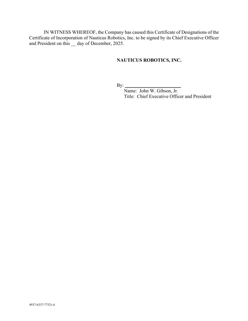 4937-6337-7752v.6 IN WITNESS WHEREOF, the Company has caused this Certificate of Designations of the Certificate of Incorporation of Nauticus Robotics, Inc. to be signed by its Chief Executive Officer and President on this __ day of December, 2025. NAUTICUS ROBOTICS, INC. By: _______________________ Name: John W. Gibson, Jr. Title: Chief Executive Officer and President
