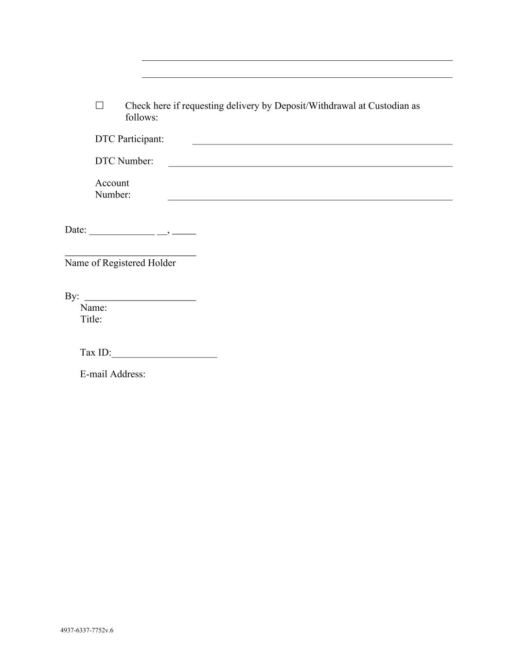 4937-6337-7752v.6 Check here if requesting delivery by Deposit/Withdrawal at Custodian as follows: DTC Participant: DTC Number: Account Number: Date: _____________ __, Name of Registered Holder By: Name: Title: Tax ID:_____________________ E-mail Address: