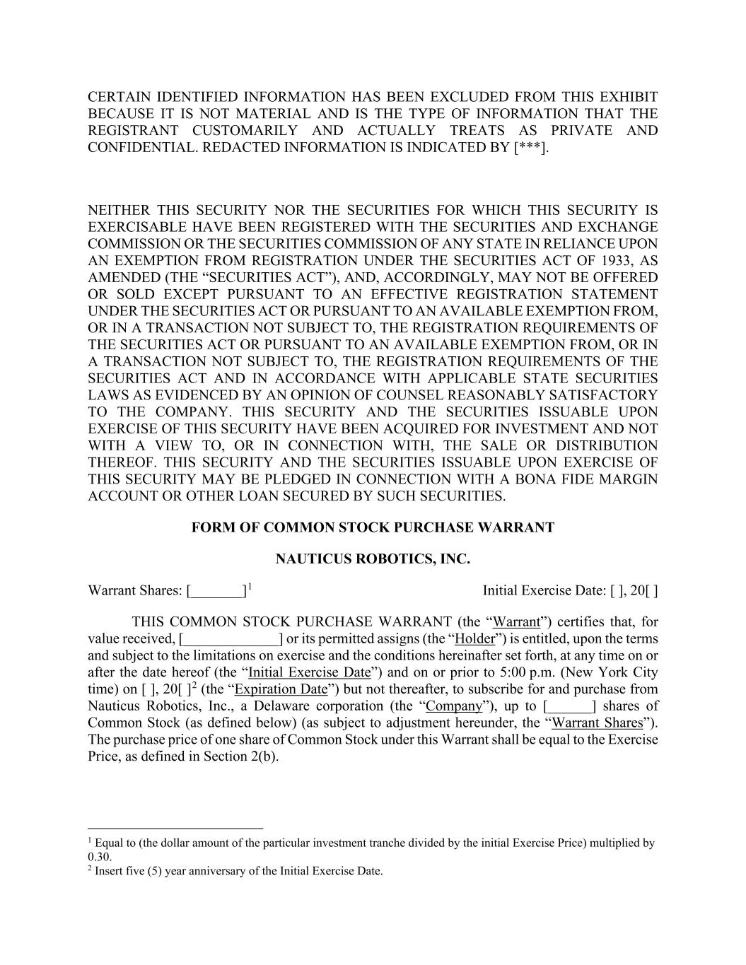 CERTAIN IDENTIFIED INFORMATION HAS BEEN EXCLUDED FROM THIS EXHIBIT BECAUSE IT IS NOT MATERIAL AND IS THE TYPE OF INFORMATION THAT THE REGISTRANT CUSTOMARILY AND ACTUALLY TREATS AS PRIVATE AND CONFIDENTIAL. REDACTED INFORMATION IS INDICATED BY [***]. NEITHER THIS SECURITY NOR THE SECURITIES FOR WHICH THIS SECURITY IS EXERCISABLE HAVE BEEN REGISTERED WITH THE SECURITIES AND EXCHANGE COMMISSION OR THE SECURITIES COMMISSION OF ANY STATE IN RELIANCE UPON AN EXEMPTION FROM REGISTRATION UNDER THE SECURITIES ACT OF 1933, AS AMENDED (THE “SECURITIES ACT”), AND, ACCORDINGLY, MAY NOT BE OFFERED OR SOLD EXCEPT PURSUANT TO AN EFFECTIVE REGISTRATION STATEMENT UNDER THE SECURITIES ACT OR PURSUANT TO AN AVAILABLE EXEMPTION FROM, OR IN A TRANSACTION NOT SUBJECT TO, THE REGISTRATION REQUIREMENTS OF THE SECURITIES ACT OR PURSUANT TO AN AVAILABLE EXEMPTION FROM, OR IN A TRANSACTION NOT SUBJECT TO, THE REGISTRATION REQUIREMENTS OF THE SECURITIES ACT AND IN ACCORDANCE WITH APPLICABLE STATE SECURITIES LAWS AS EVIDENCED BY AN OPINION OF COUNSEL REASONABLY SATISFACTORY TO THE COMPANY. THIS SECURITY AND THE SECURITIES ISSUABLE UPON EXERCISE OF THIS SECURITY HAVE BEEN ACQUIRED FOR INVESTMENT AND NOT WITH A VIEW TO, OR IN CONNECTION WITH, THE SALE OR DISTRIBUTION THEREOF. THIS SECURITY AND THE SECURITIES ISSUABLE UPON EXERCISE OF THIS SECURITY MAY BE PLEDGED IN CONNECTION WITH A BONA FIDE MARGIN ACCOUNT OR OTHER LOAN SECURED BY SUCH SECURITIES. FORM OF COMMON STOCK PURCHASE WARRANT NAUTICUS ROBOTICS, INC. Warrant Shares: [_______]1 Initial Exercise Date: [ ], 20[ ] THIS COMMON STOCK PURCHASE WARRANT (the “Warrant”) certifies that, for value received, [_____________] or its permitted assigns (the “Holder”) is entitled, upon the terms and subject to the limitations on exercise and the conditions hereinafter set forth, at any time on or after the date hereof (the “Initial Exercise Date”) and on or prior to 5:00 p.m. (New York City time) on [ ], 20[ ]2 (the “Expiration Date”) but not thereafter, to subscribe for and purchase from Nauticus Robotics, Inc., a Delaware corporation (the “Company”), up to [______] shares of Common Stock (as defined below) (as subject to adjustment hereunder, the “Warrant Shares”). The purchase price of one share of Common Stock under this Warrant shall be equal to the Exercise Price, as defined in Section 2(b). 1 Equal to (the dollar amount of the particular investment tranche divided by the initial Exercise Price) multiplied by 0.30. 2 Insert five (5) year anniversary of the Initial Exercise Date.