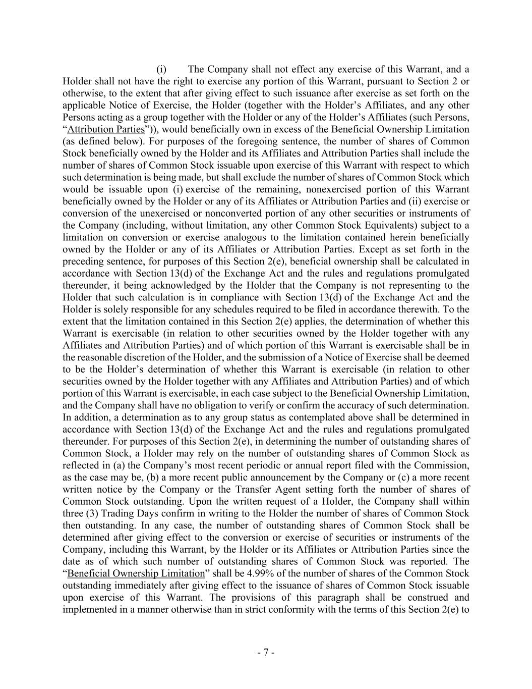 - 7 - (i) The Company shall not effect any exercise of this Warrant, and a Holder shall not have the right to exercise any portion of this Warrant, pursuant to Section 2 or otherwise, to the extent that after giving effect to such issuance after exercise as set forth on the applicable Notice of Exercise, the Holder (together with the Holder’s Affiliates, and any other Persons acting as a group together with the Holder or any of the Holder’s Affiliates (such Persons, “Attribution Parties”)), would beneficially own in excess of the Beneficial Ownership Limitation (as defined below). For purposes of the foregoing sentence, the number of shares of Common Stock beneficially owned by the Holder and its Affiliates and Attribution Parties shall include the number of shares of Common Stock issuable upon exercise of this Warrant with respect to which such determination is being made, but shall exclude the number of shares of Common Stock which would be issuable upon (i) exercise of the remaining, nonexercised portion of this Warrant beneficially owned by the Holder or any of its Affiliates or Attribution Parties and (ii) exercise or conversion of the unexercised or nonconverted portion of any other securities or instruments of the Company (including, without limitation, any other Common Stock Equivalents) subject to a limitation on conversion or exercise analogous to the limitation contained herein beneficially owned by the Holder or any of its Affiliates or Attribution Parties. Except as set forth in the preceding sentence, for purposes of this Section 2(e), beneficial ownership shall be calculated in accordance with Section 13(d) of the Exchange Act and the rules and regulations promulgated thereunder, it being acknowledged by the Holder that the Company is not representing to the Holder that such calculation is in compliance with Section 13(d) of the Exchange Act and the Holder is solely responsible for any schedules required to be filed in accordance therewith. To the extent that the limitation contained in this Section 2(e) applies, the determination of whether this Warrant is exercisable (in relation to other securities owned by the Holder together with any Affiliates and Attribution Parties) and of which portion of this Warrant is exercisable shall be in the reasonable discretion of the Holder, and the submission of a Notice of Exercise shall be deemed to be the Holder’s determination of whether this Warrant is exercisable (in relation to other securities owned by the Holder together with any Affiliates and Attribution Parties) and of which portion of this Warrant is exercisable, in each case subject to the Beneficial Ownership Limitation, and the Company shall have no obligation to verify or confirm the accuracy of such determination. In addition, a determination as to any group status as contemplated above shall be determined in accordance with Section 13(d) of the Exchange Act and the rules and regulations promulgated thereunder. For purposes of this Section 2(e), in determining the number of outstanding shares of Common Stock, a Holder may rely on the number of outstanding shares of Common Stock as reflected in (a) the Company’s most recent periodic or annual report filed with the Commission, as the case may be, (b) a more recent public announcement by the Company or (c) a more recent written notice by the Company or the Transfer Agent setting forth the number of shares of Common Stock outstanding. Upon the written request of a Holder, the Company shall within three (3) Trading Days confirm in writing to the Holder the number of shares of Common Stock then outstanding. In any case, the number of outstanding shares of Common Stock shall be determined after giving effect to the conversion or exercise of securities or instruments of the Company, including this Warrant, by the Holder or its Affiliates or Attribution Parties since the date as of which such number of outstanding shares of Common Stock was reported. The “Beneficial Ownership Limitation” shall be 4.99% of the number of shares of the Common Stock outstanding immediately after giving effect to the issuance of shares of Common Stock issuable upon exercise of this Warrant. The provisions of this paragraph shall be construed and implemented in a manner otherwise than in strict conformity with the terms of this Section 2(e) to