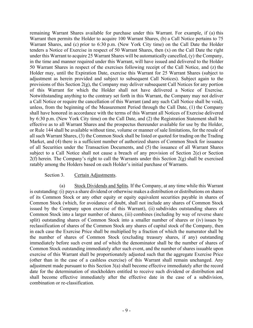 - 9 - remaining Warrant Shares available for purchase under this Warrant. For example, if (a) this Warrant then permits the Holder to acquire 100 Warrant Shares, (b) a Call Notice pertains to 75 Warrant Shares, and (c) prior to 6:30 p.m. (New York City time) on the Call Date the Holder tenders a Notice of Exercise in respect of 50 Warrant Shares, then (x) on the Call Date the right under this Warrant to acquire 25 Warrant Shares will be automatically cancelled, (y) the Company, in the time and manner required under this Warrant, will have issued and delivered to the Holder 50 Warrant Shares in respect of the exercises following receipt of the Call Notice, and (z) the Holder may, until the Expiration Date, exercise this Warrant for 25 Warrant Shares (subject to adjustment as herein provided and subject to subsequent Call Notices). Subject again to the provisions of this Section 2(g), the Company may deliver subsequent Call Notices for any portion of this Warrant for which the Holder shall not have delivered a Notice of Exercise. Notwithstanding anything to the contrary set forth in this Warrant, the Company may not deliver a Call Notice or require the cancellation of this Warrant (and any such Call Notice shall be void), unless, from the beginning of the Measurement Period through the Call Date, (1) the Company shall have honored in accordance with the terms of this Warrant all Notices of Exercise delivered by 6:30 p.m. (New York City time) on the Call Date, and (2) the Registration Statement shall be effective as to all Warrant Shares and the prospectus thereunder available for use by the Holder, or Rule 144 shall be available without time, volume or manner of sale limitations, for the resale of all such Warrant Shares, (3) the Common Stock shall be listed or quoted for trading on the Trading Market, and (4) there is a sufficient number of authorized shares of Common Stock for issuance of all Securities under the Transaction Documents, and (5) the issuance of all Warrant Shares subject to a Call Notice shall not cause a breach of any provision of Section 2(e) or Section 2(f) herein. The Company’s right to call the Warrants under this Section 2(g) shall be exercised ratably among the Holders based on each Holder’s initial purchase of Warrants. Section 3. Certain Adjustments. (a) Stock Dividends and Splits. If the Company, at any time while this Warrant is outstanding: (i) pays a share dividend or otherwise makes a distribution or distributions on shares of its Common Stock or any other equity or equity equivalent securities payable in shares of Common Stock (which, for avoidance of doubt, shall not include any shares of Common Stock issued by the Company upon exercise of this Warrant), (ii) subdivides outstanding shares of Common Stock into a larger number of shares, (iii) combines (including by way of reverse share split) outstanding shares of Common Stock into a smaller number of shares or (iv) issues by reclassification of shares of the Common Stock any shares of capital stock of the Company, then in each case the Exercise Price shall be multiplied by a fraction of which the numerator shall be the number of shares of Common Stock (excluding treasury shares, if any) outstanding immediately before such event and of which the denominator shall be the number of shares of Common Stock outstanding immediately after such event, and the number of shares issuable upon exercise of this Warrant shall be proportionately adjusted such that the aggregate Exercise Price (other than in the case of a cashless exercise) of this Warrant shall remain unchanged. Any adjustment made pursuant to this Section 3(a) shall become effective immediately after the record date for the determination of stockholders entitled to receive such dividend or distribution and shall become effective immediately after the effective date in the case of a subdivision, combination or re-classification.