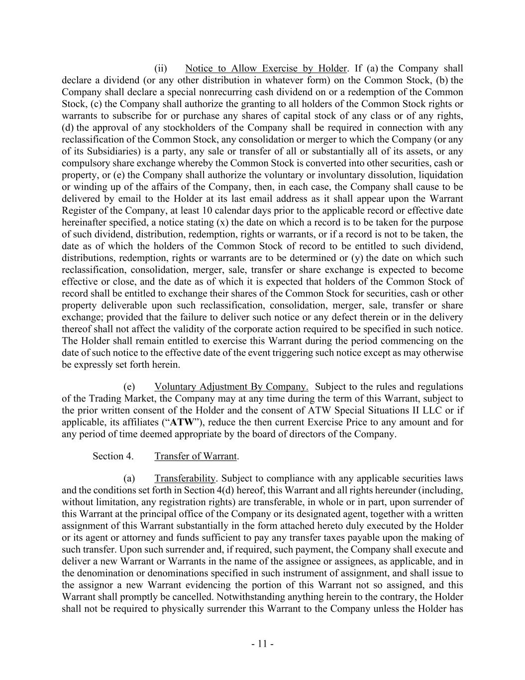 - 11 - (ii) Notice to Allow Exercise by Holder. If (a) the Company shall declare a dividend (or any other distribution in whatever form) on the Common Stock, (b) the Company shall declare a special nonrecurring cash dividend on or a redemption of the Common Stock, (c) the Company shall authorize the granting to all holders of the Common Stock rights or warrants to subscribe for or purchase any shares of capital stock of any class or of any rights, (d) the approval of any stockholders of the Company shall be required in connection with any reclassification of the Common Stock, any consolidation or merger to which the Company (or any of its Subsidiaries) is a party, any sale or transfer of all or substantially all of its assets, or any compulsory share exchange whereby the Common Stock is converted into other securities, cash or property, or (e) the Company shall authorize the voluntary or involuntary dissolution, liquidation or winding up of the affairs of the Company, then, in each case, the Company shall cause to be delivered by email to the Holder at its last email address as it shall appear upon the Warrant Register of the Company, at least 10 calendar days prior to the applicable record or effective date hereinafter specified, a notice stating (x) the date on which a record is to be taken for the purpose of such dividend, distribution, redemption, rights or warrants, or if a record is not to be taken, the date as of which the holders of the Common Stock of record to be entitled to such dividend, distributions, redemption, rights or warrants are to be determined or (y) the date on which such reclassification, consolidation, merger, sale, transfer or share exchange is expected to become effective or close, and the date as of which it is expected that holders of the Common Stock of record shall be entitled to exchange their shares of the Common Stock for securities, cash or other property deliverable upon such reclassification, consolidation, merger, sale, transfer or share exchange; provided that the failure to deliver such notice or any defect therein or in the delivery thereof shall not affect the validity of the corporate action required to be specified in such notice. The Holder shall remain entitled to exercise this Warrant during the period commencing on the date of such notice to the effective date of the event triggering such notice except as may otherwise be expressly set forth herein. (e) Voluntary Adjustment By Company. Subject to the rules and regulations of the Trading Market, the Company may at any time during the term of this Warrant, subject to the prior written consent of the Holder and the consent of ATW Special Situations II LLC or if applicable, its affiliates (“ATW”), reduce the then current Exercise Price to any amount and for any period of time deemed appropriate by the board of directors of the Company. Section 4. Transfer of Warrant. (a) Transferability. Subject to compliance with any applicable securities laws and the conditions set forth in Section 4(d) hereof, this Warrant and all rights hereunder (including, without limitation, any registration rights) are transferable, in whole or in part, upon surrender of this Warrant at the principal office of the Company or its designated agent, together with a written assignment of this Warrant substantially in the form attached hereto duly executed by the Holder or its agent or attorney and funds sufficient to pay any transfer taxes payable upon the making of such transfer. Upon such surrender and, if required, such payment, the Company shall execute and deliver a new Warrant or Warrants in the name of the assignee or assignees, as applicable, and in the denomination or denominations specified in such instrument of assignment, and shall issue to the assignor a new Warrant evidencing the portion of this Warrant not so assigned, and this Warrant shall promptly be cancelled. Notwithstanding anything herein to the contrary, the Holder shall not be required to physically surrender this Warrant to the Company unless the Holder has